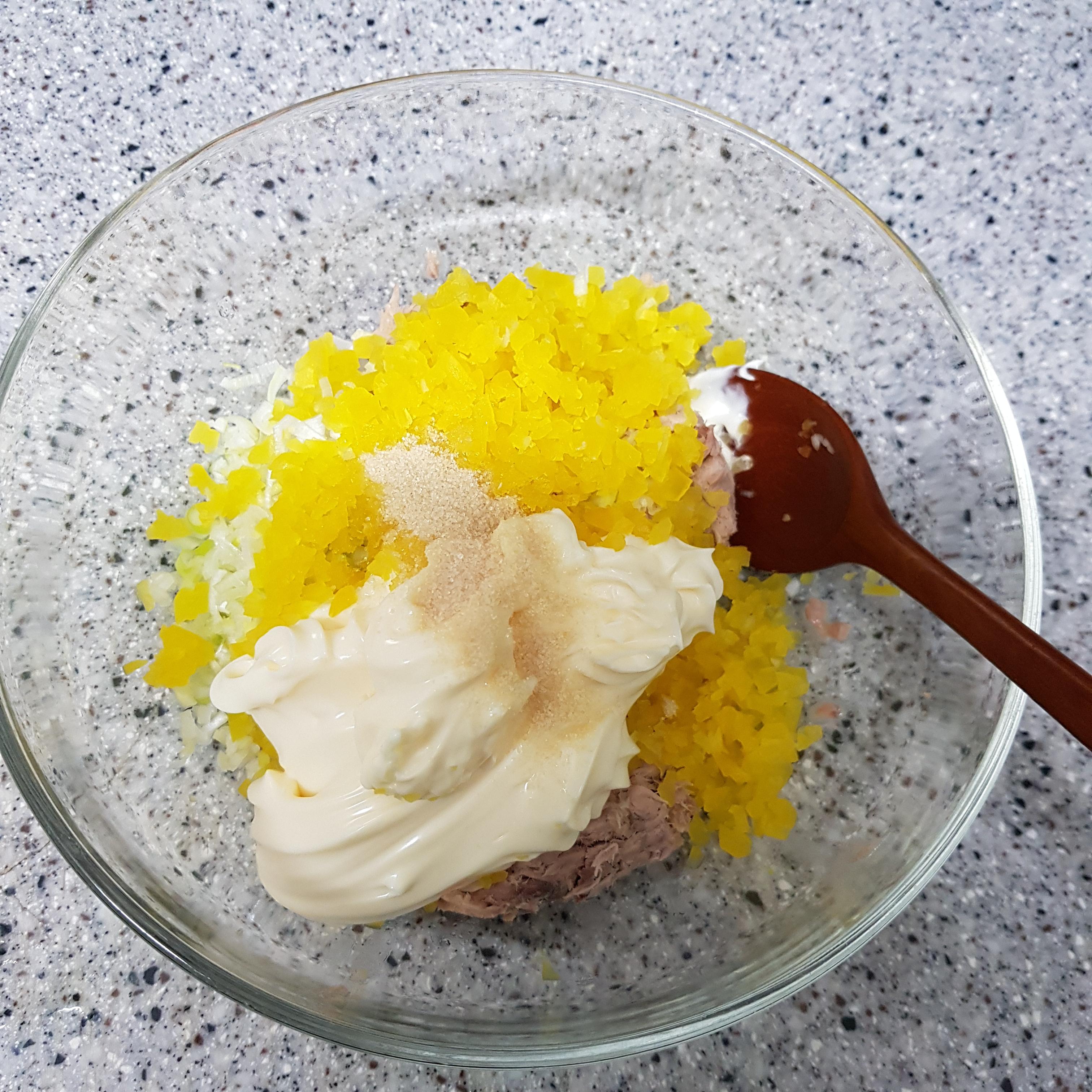 ▶ 마요네즈 역시 참치캔으로 계량하여 1캔, 고춧가루 1큰술, 설탕 1/2큰술을 넣고 골고루 섞어주면 백파더꼬마김밥 참치 소 완성입니다