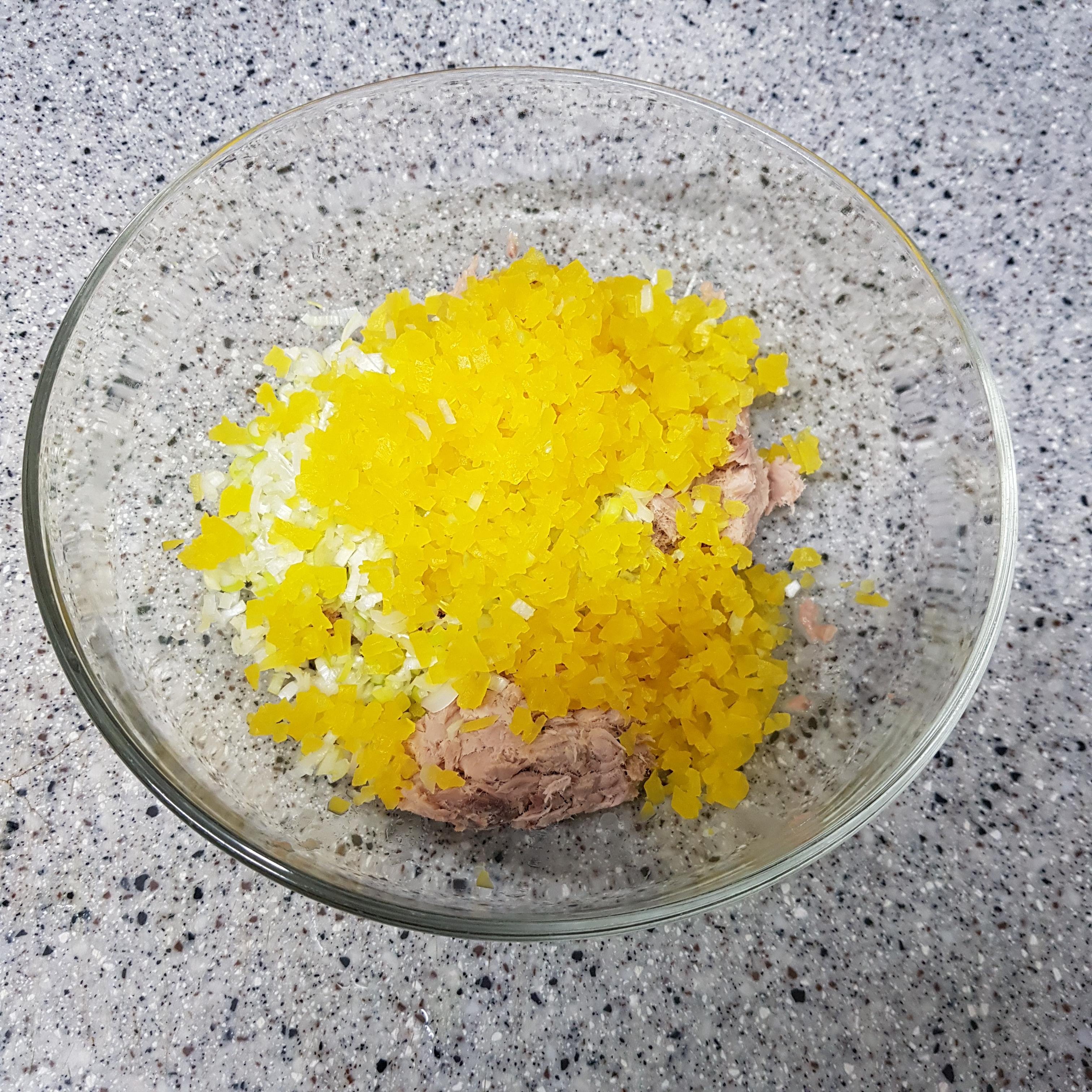 ▶ 참치 1캔을 넣은 볼에다가 단무지와 대파 흰 부분을 넣어주세요