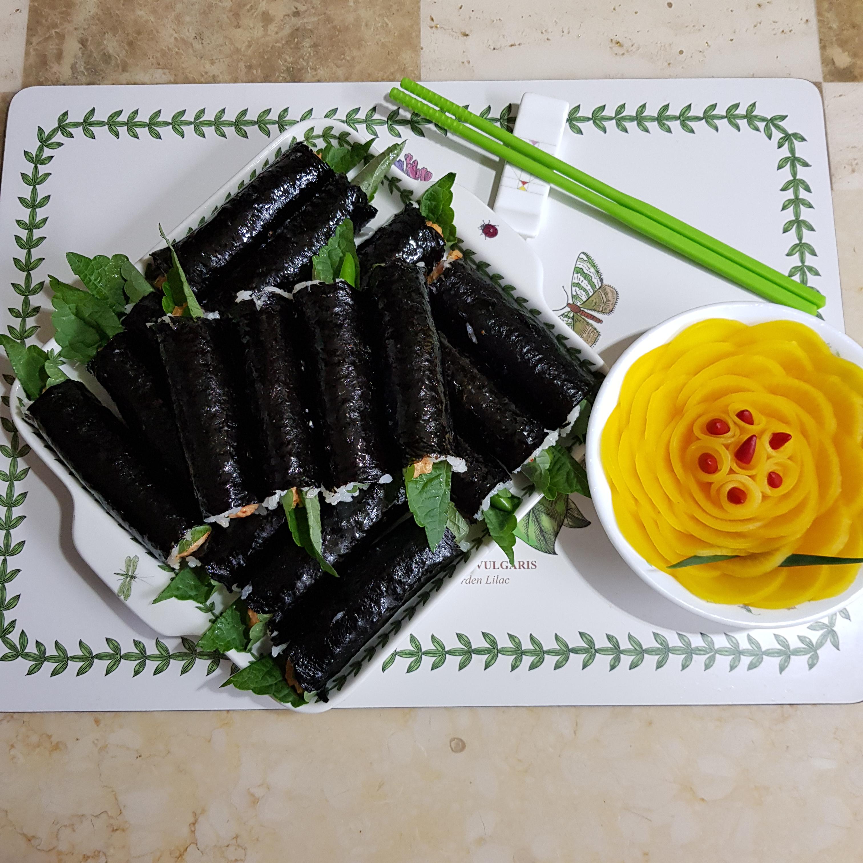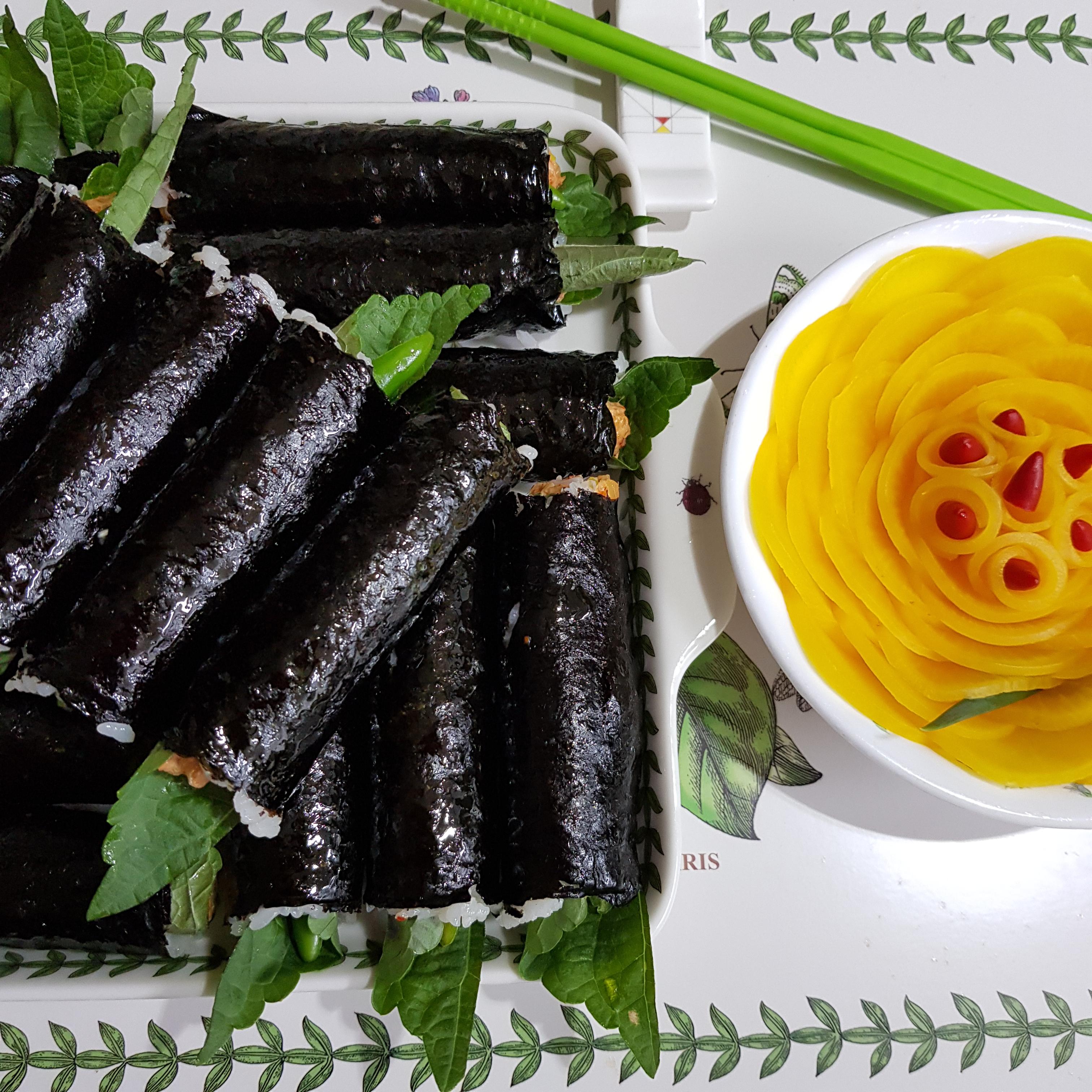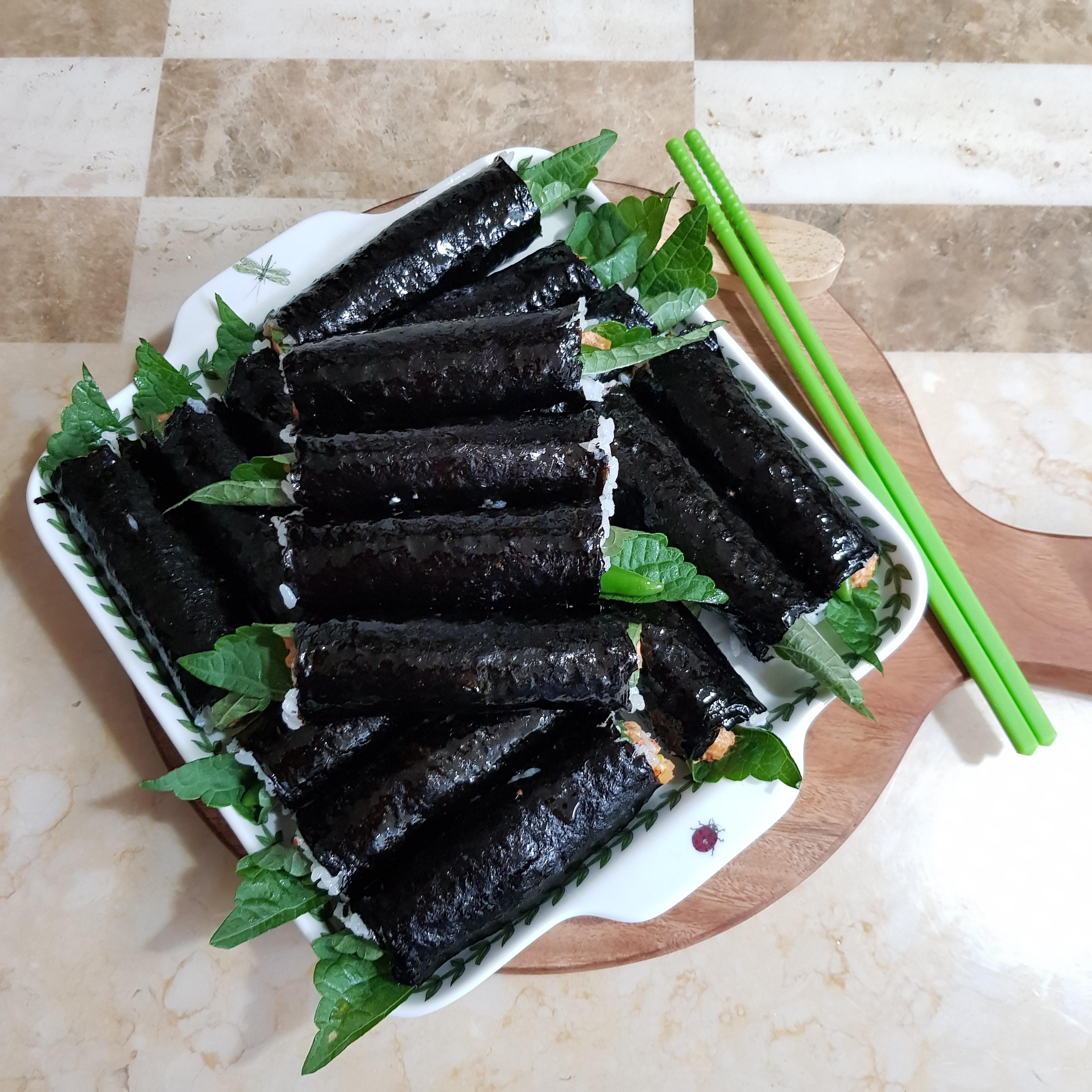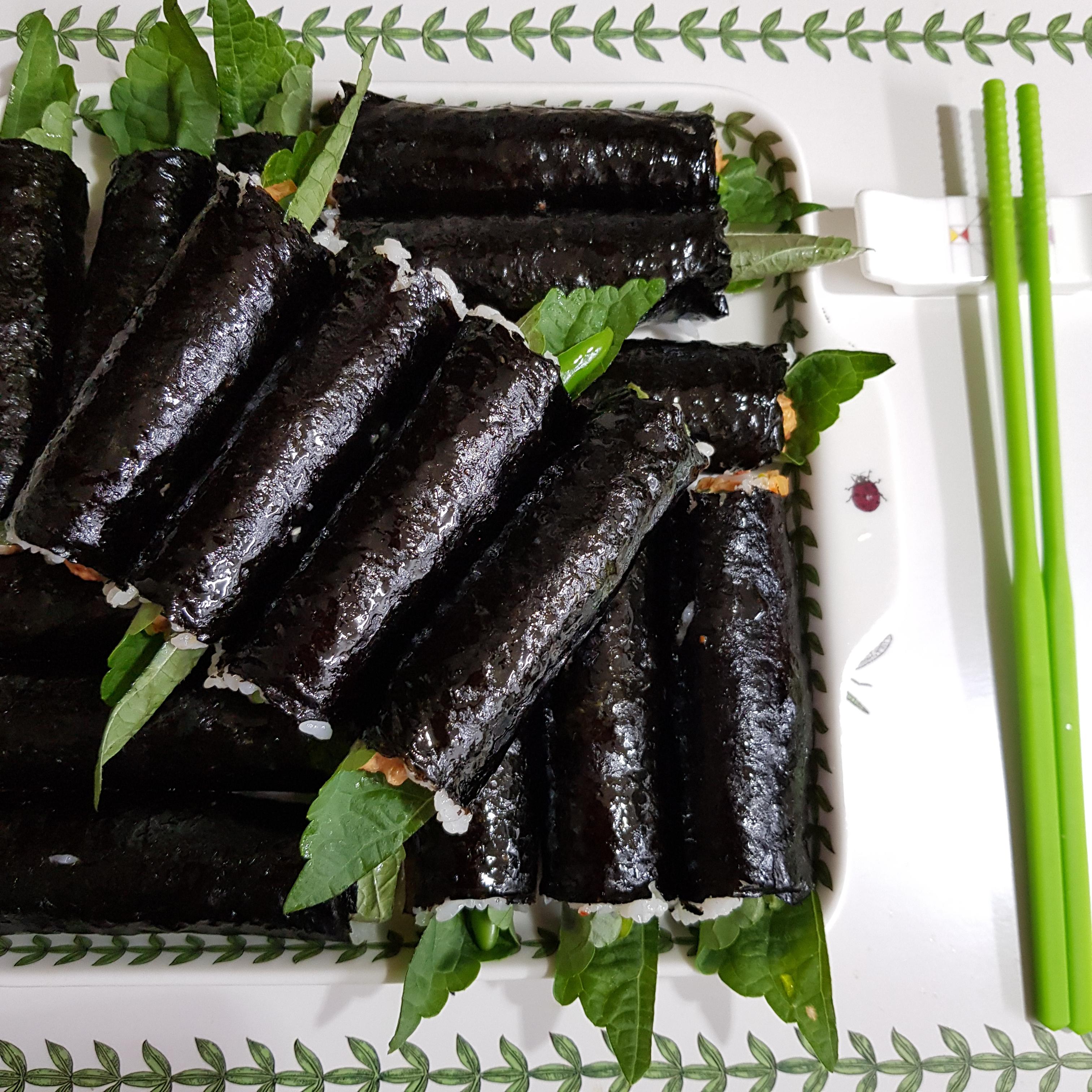 ▶ 김밥 말때 참치 소가 손에 묻지 않기 위해서 먼저 깻잎으로 참치 소를 말아주고 마지막으로 김을 돌돌 말아주면 백파더꼬마김밥 완성입니다^^
