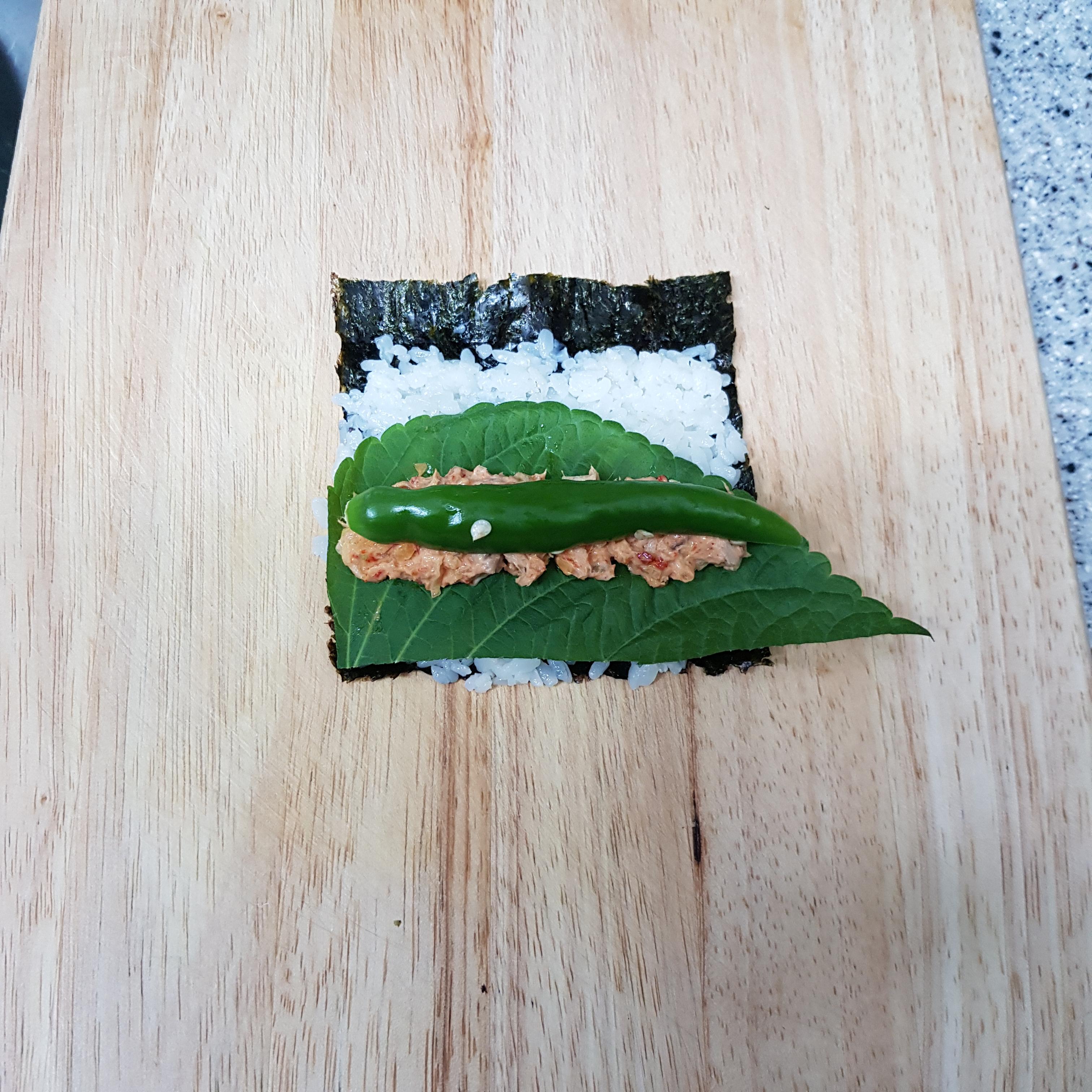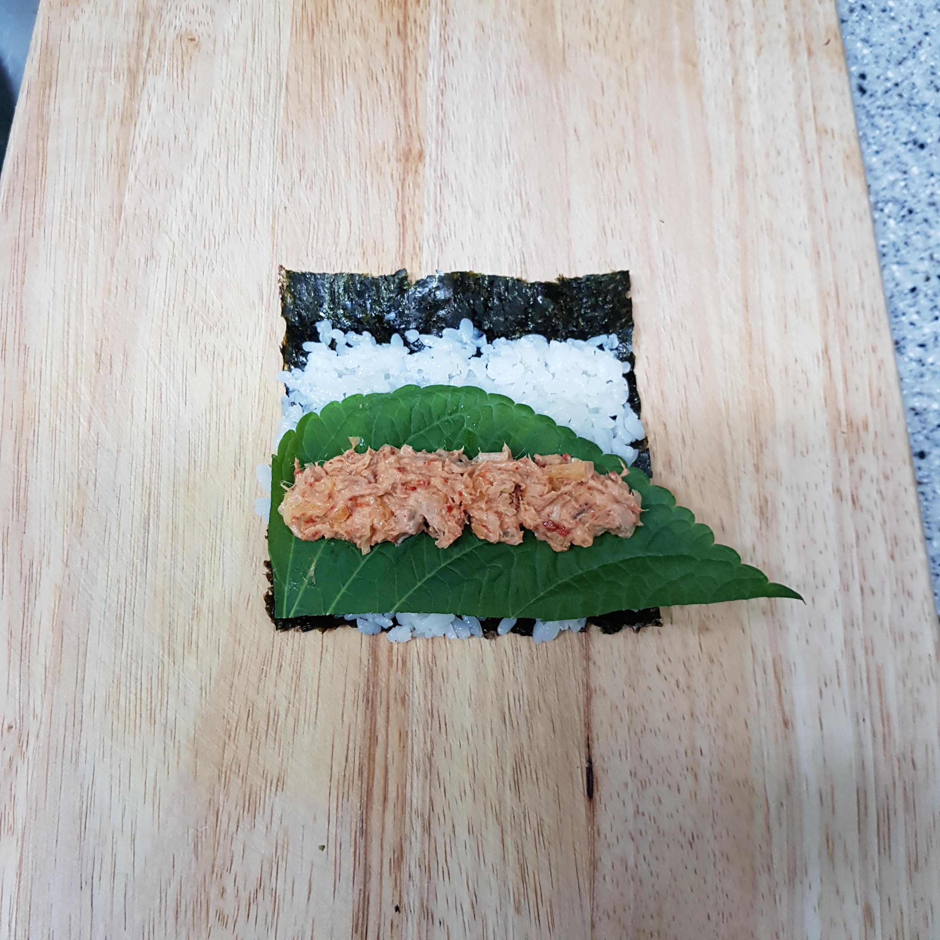 ▶ 깻잎 위에 참치소 1/2큰술을 올려주세요