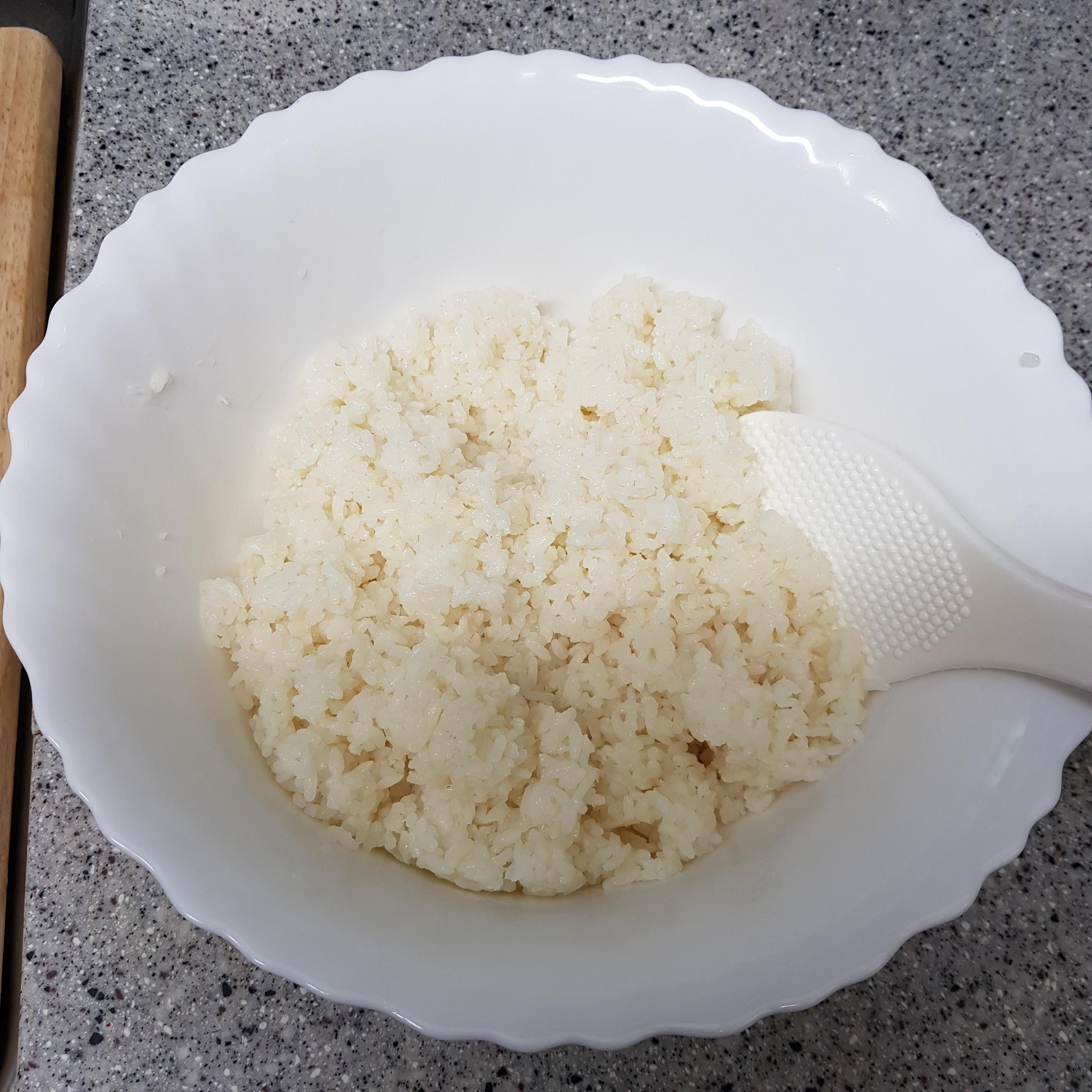 ▶ 밥은 참치캔으로 계량해 8캔을 볼에 넣고 꽃소금 1/4큰술, 참기름 2큰술을 넣고 골고루 섞어 준비해주세요