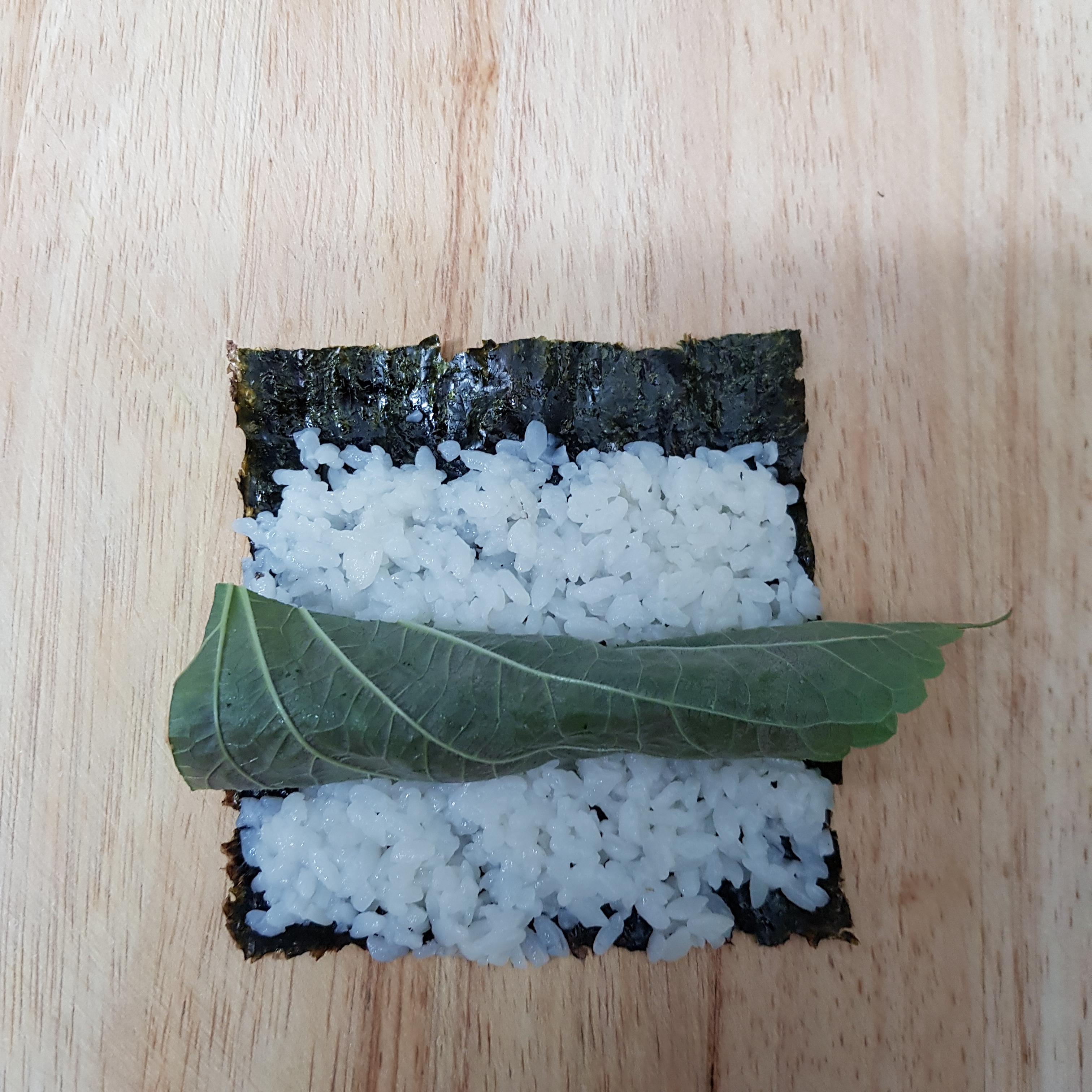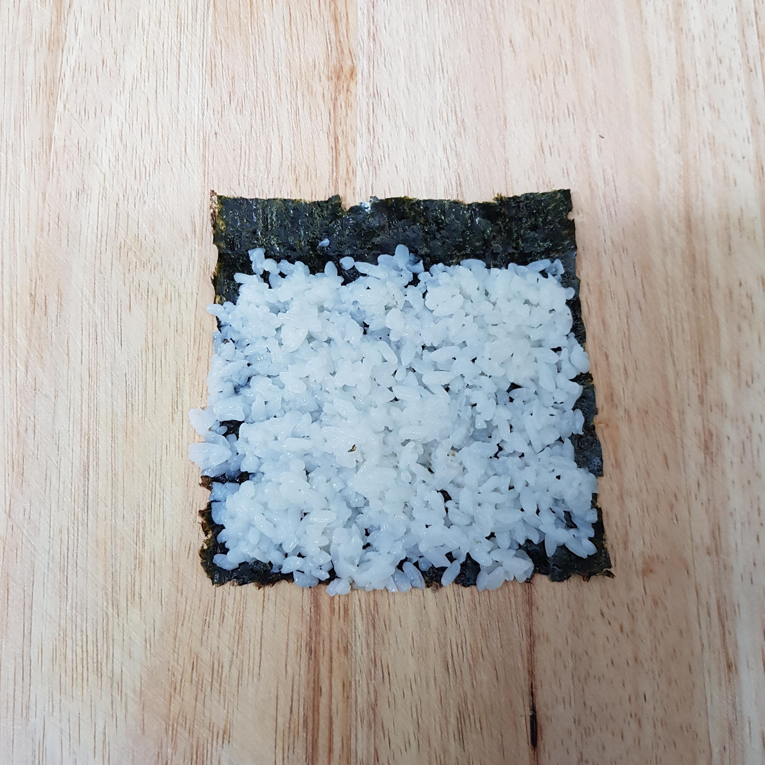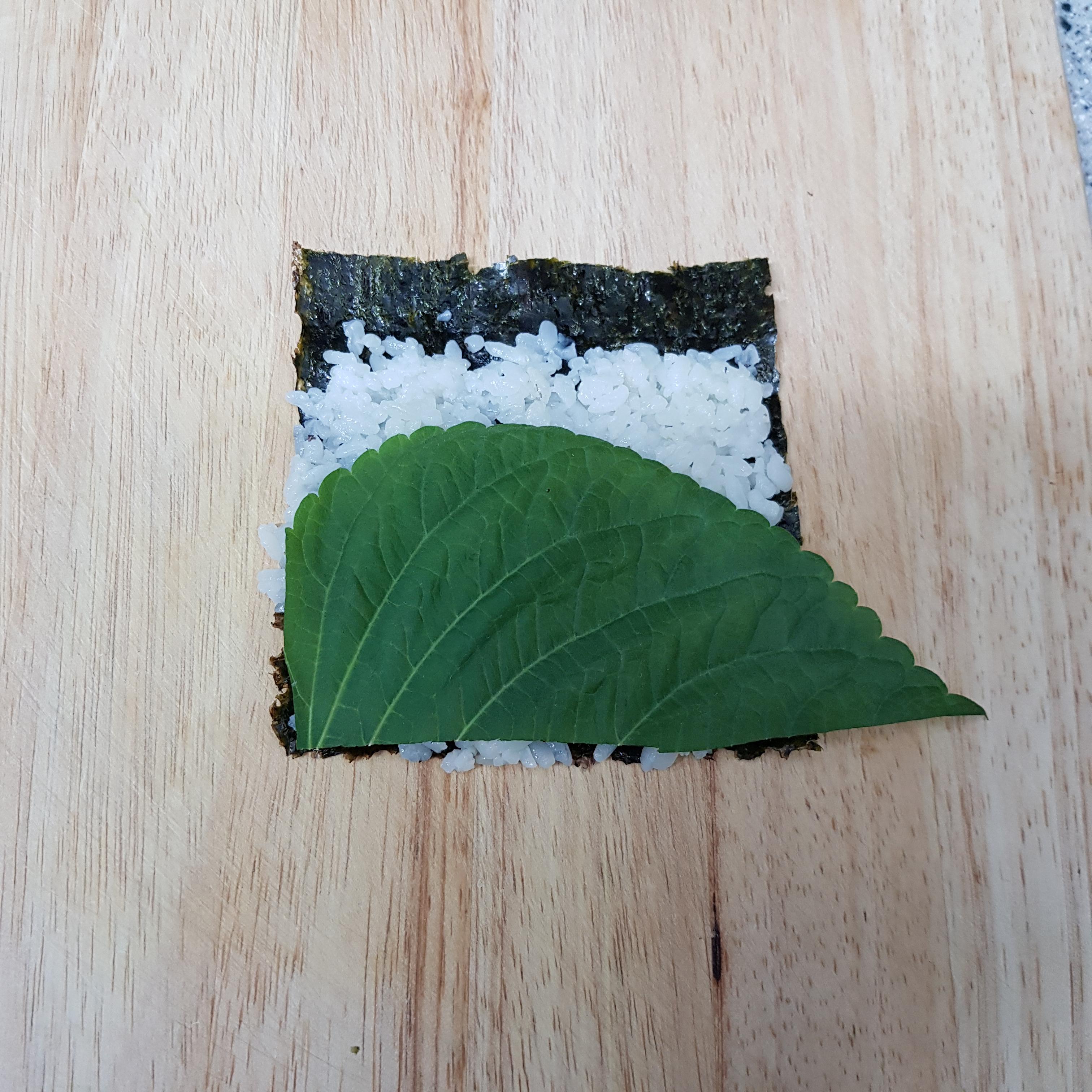 ▶ 4등분으로 자른 김밥김 위에 김 끝부분을 약간 남겨두고 밥을 골고루 펴주세요 밥 양은 골프공 정도 크기로 동그랗게 쥐면 적당하답니다 밥위에 깻잎을 올려주세요