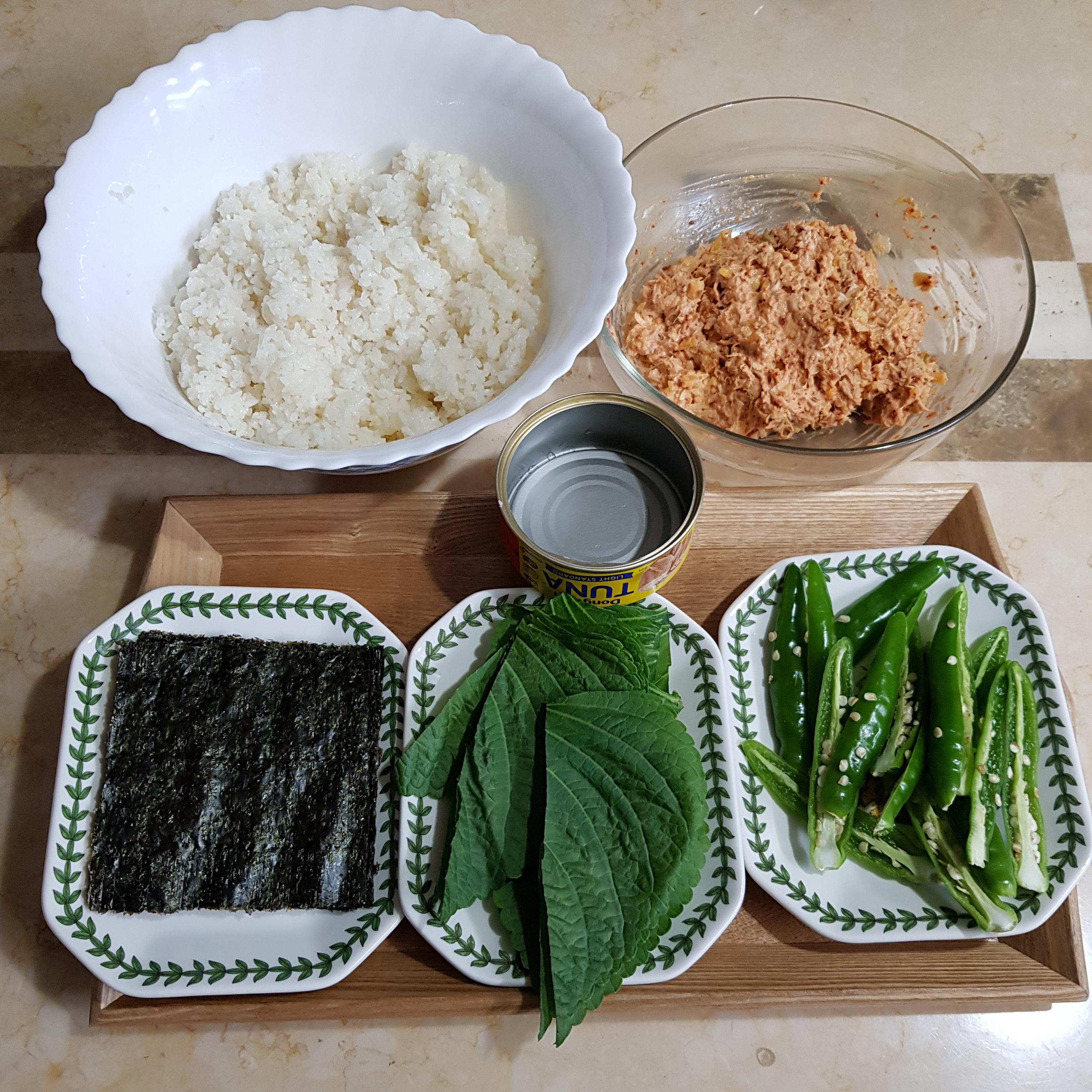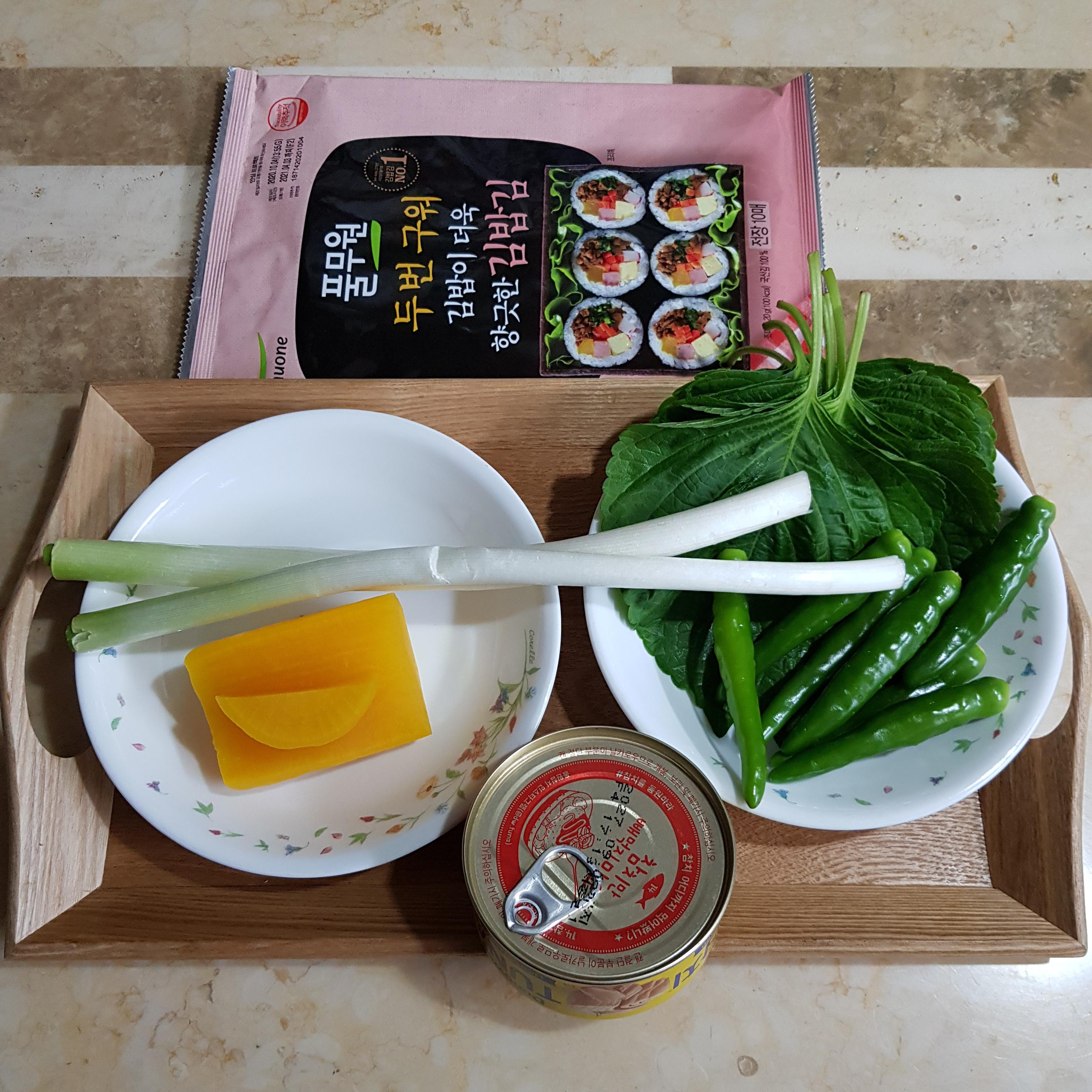 김밥김 4장, 참치 1캔, 단무지 1캔, 대파 흰부분 1캔, 밥 8캔, 깻잎 8장, 청양고추 8개