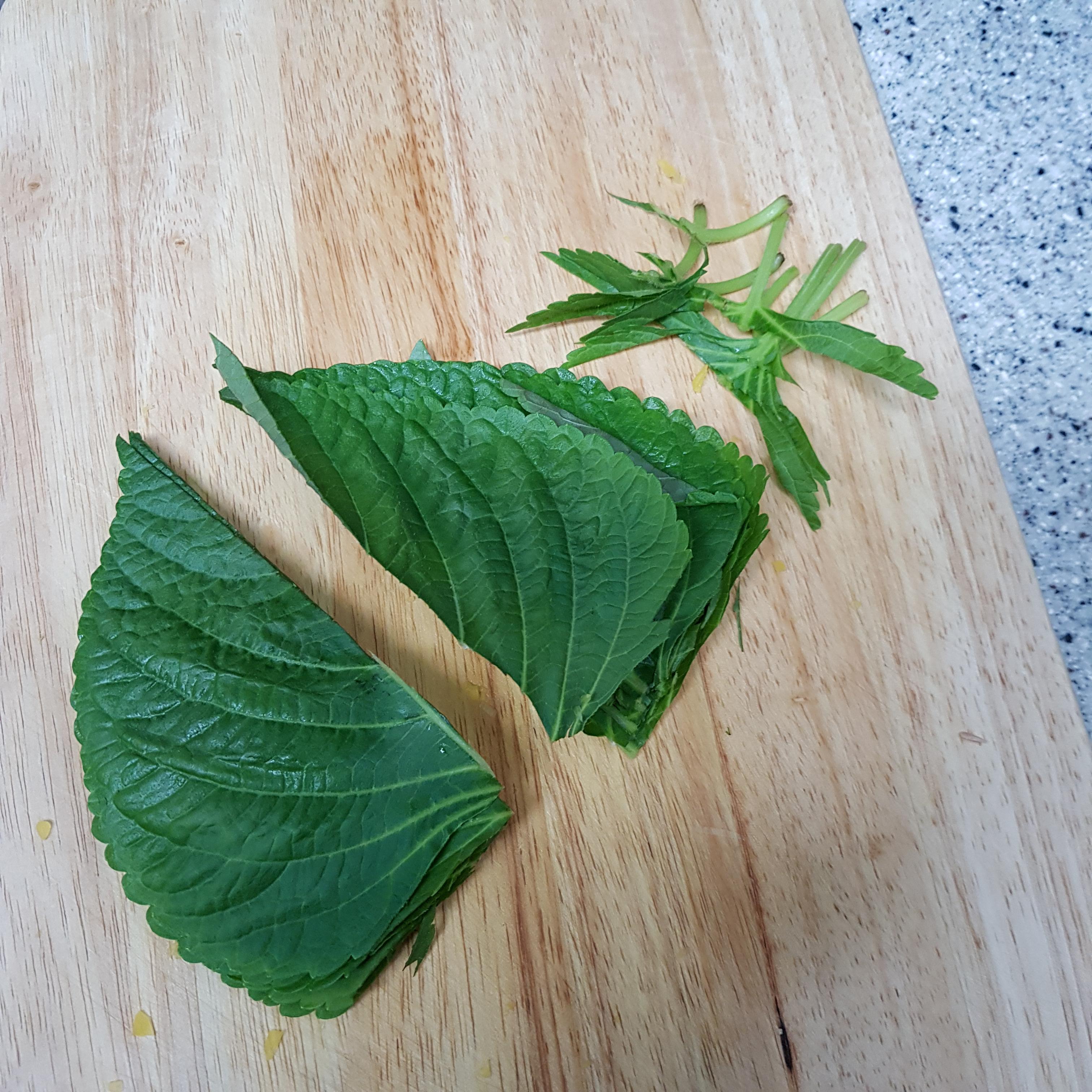 ▶ 깻잎 8장은 꼭지부분을 자르고 세로로 2 등분하여 잘라주세요