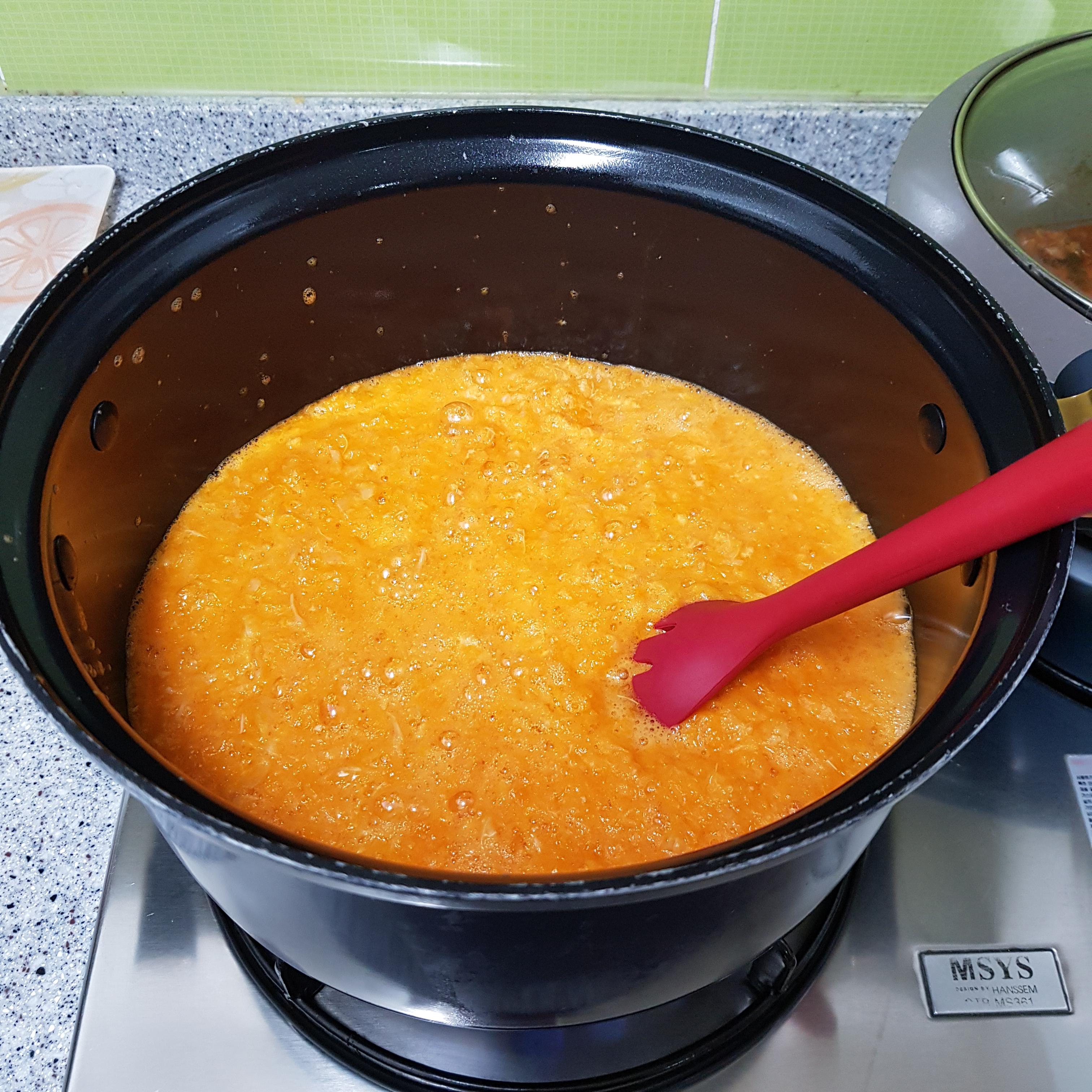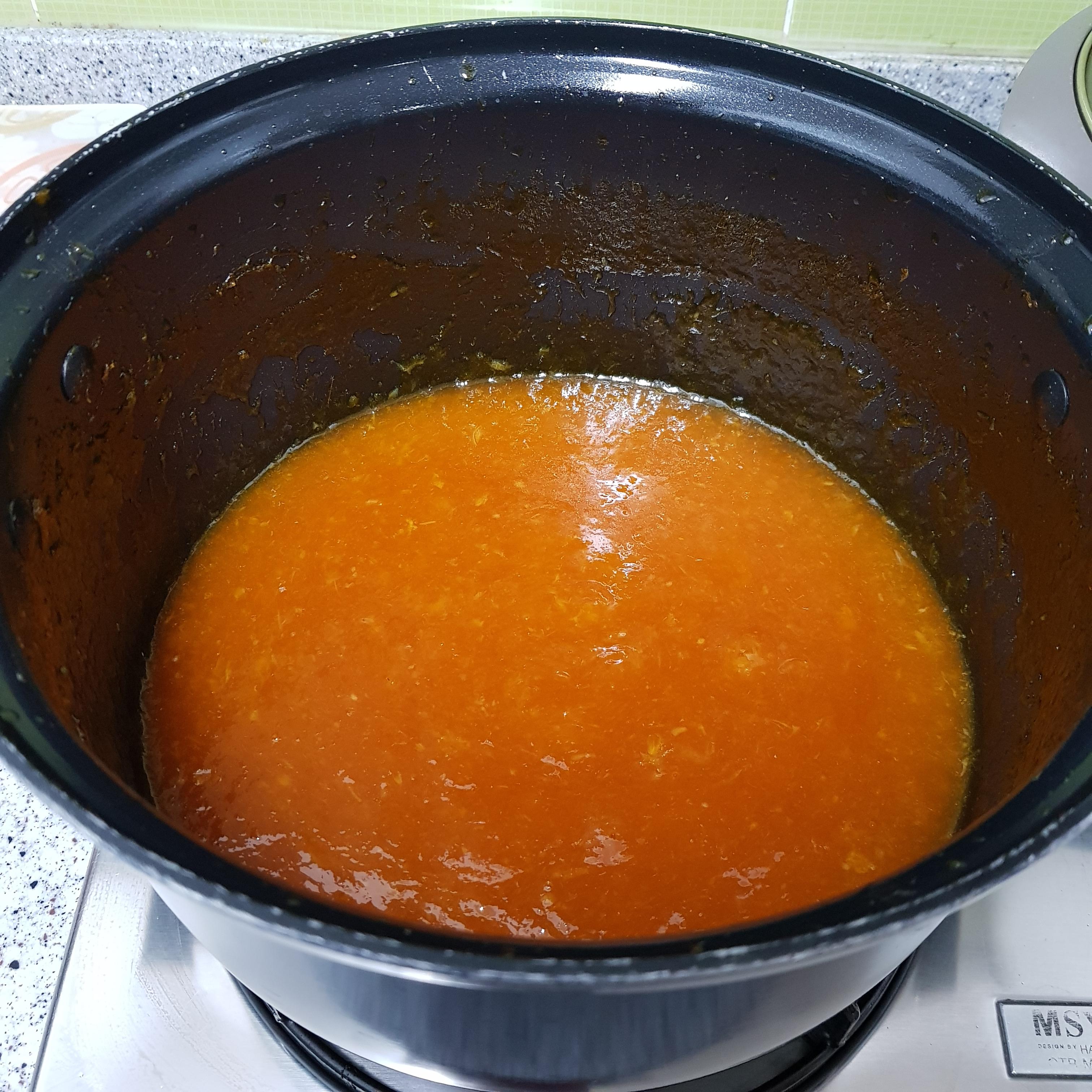 ▶ 믹서기에 갈아준 귤은 넉넉한 냄비에 넣고 센 불에서 30분 정도 끓여주고 이때 뜨는 거품은 중간중간 걷어내 주세요