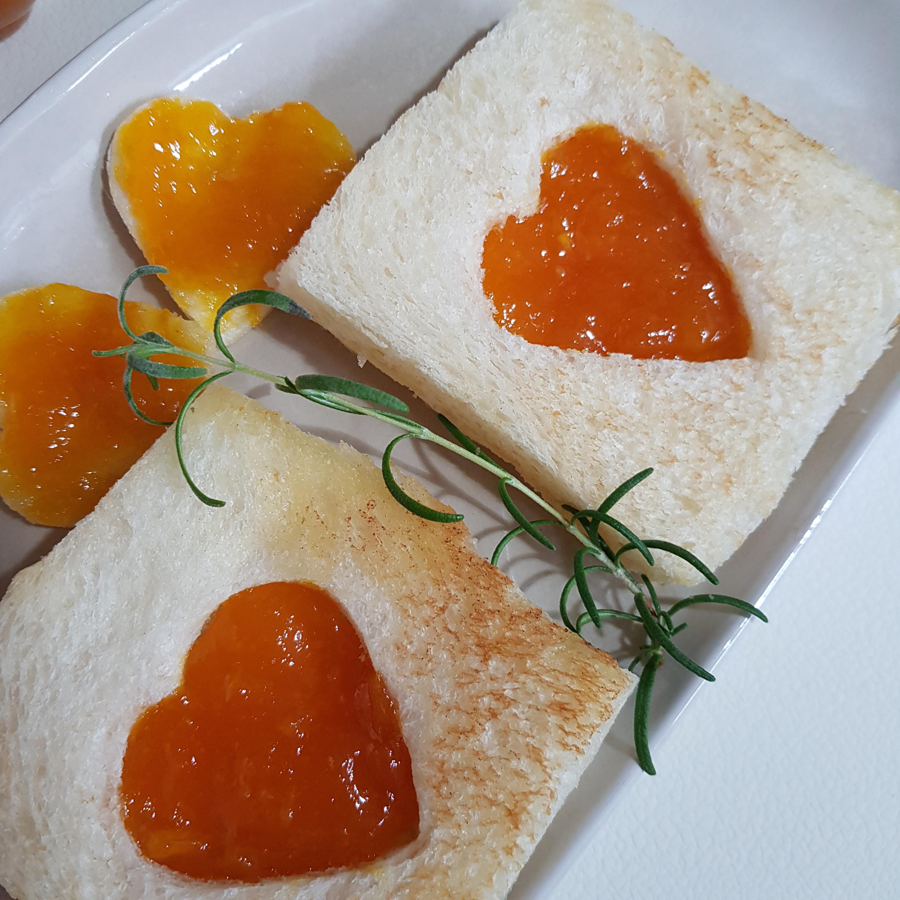 ▶ 구운 빵에 귤잼 발라만 줘도 맛있지만 저는 틀을 이용해 하트 모양을 찍어주고 하트 안에 귤잼을 넣어 더 맛있어 보이게 만들었답니다^^
