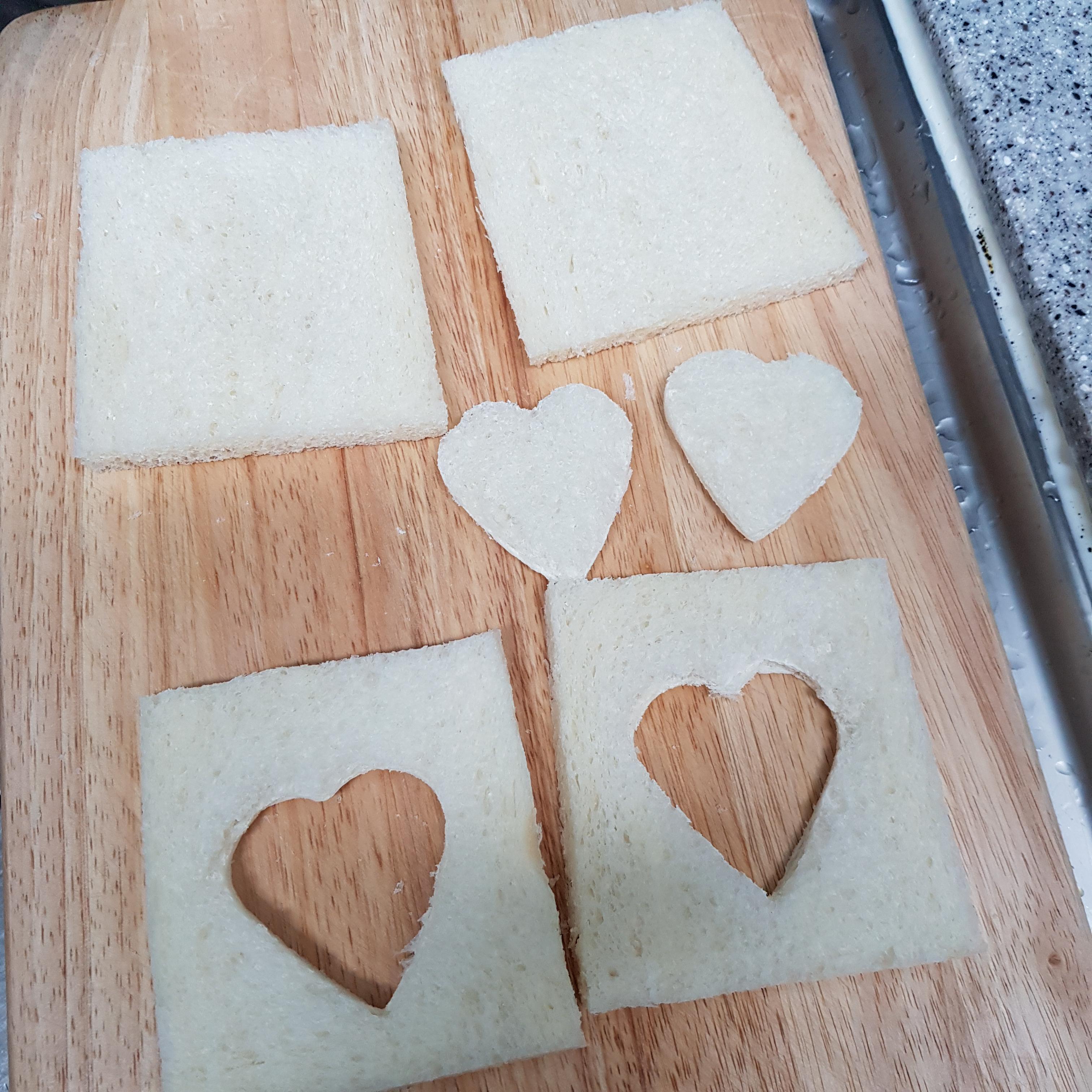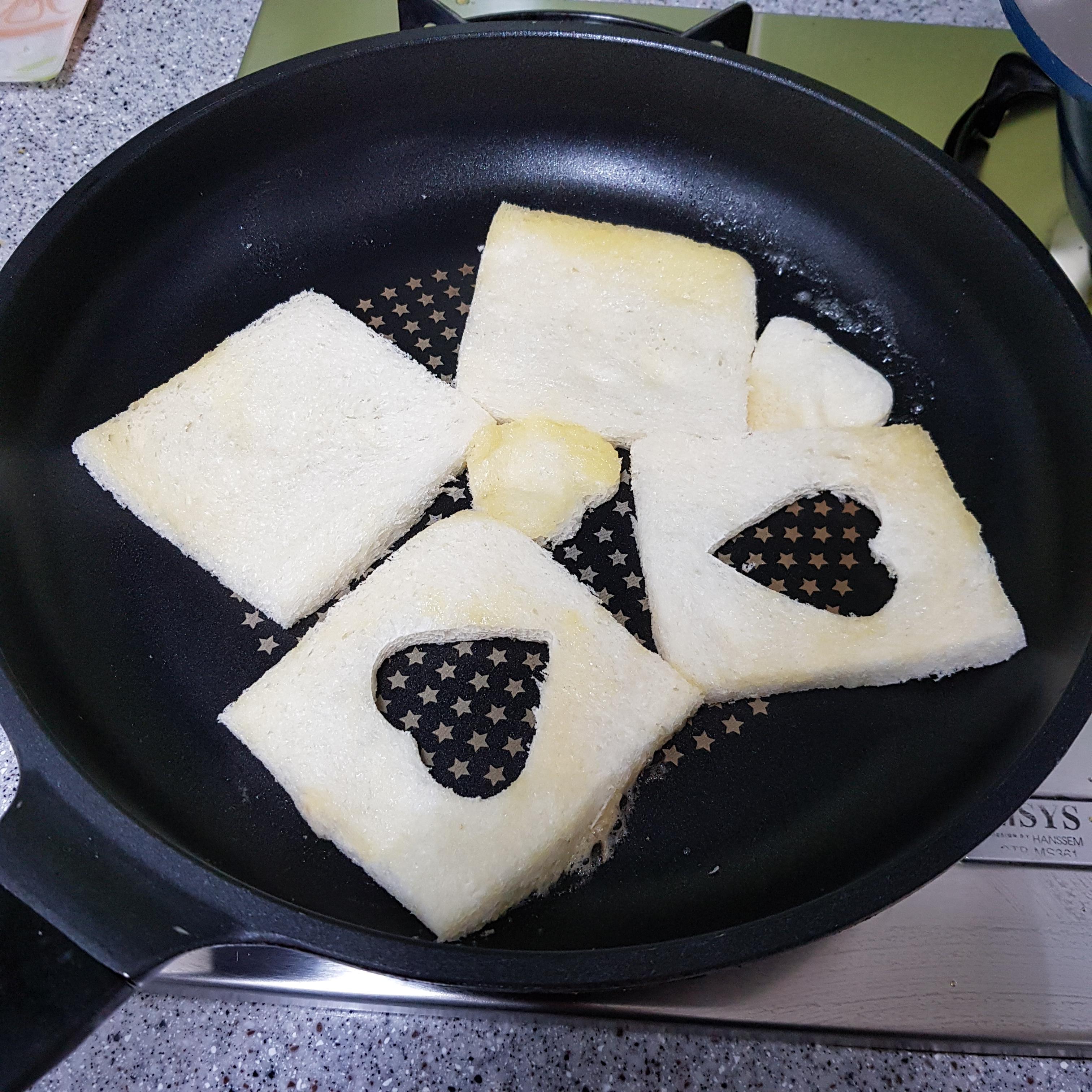 ▶ 식빵 테두리를 잘라주고 모양 틀로 찍은 후 예열된 팬에 버터 바르고 살짝 구워주세요