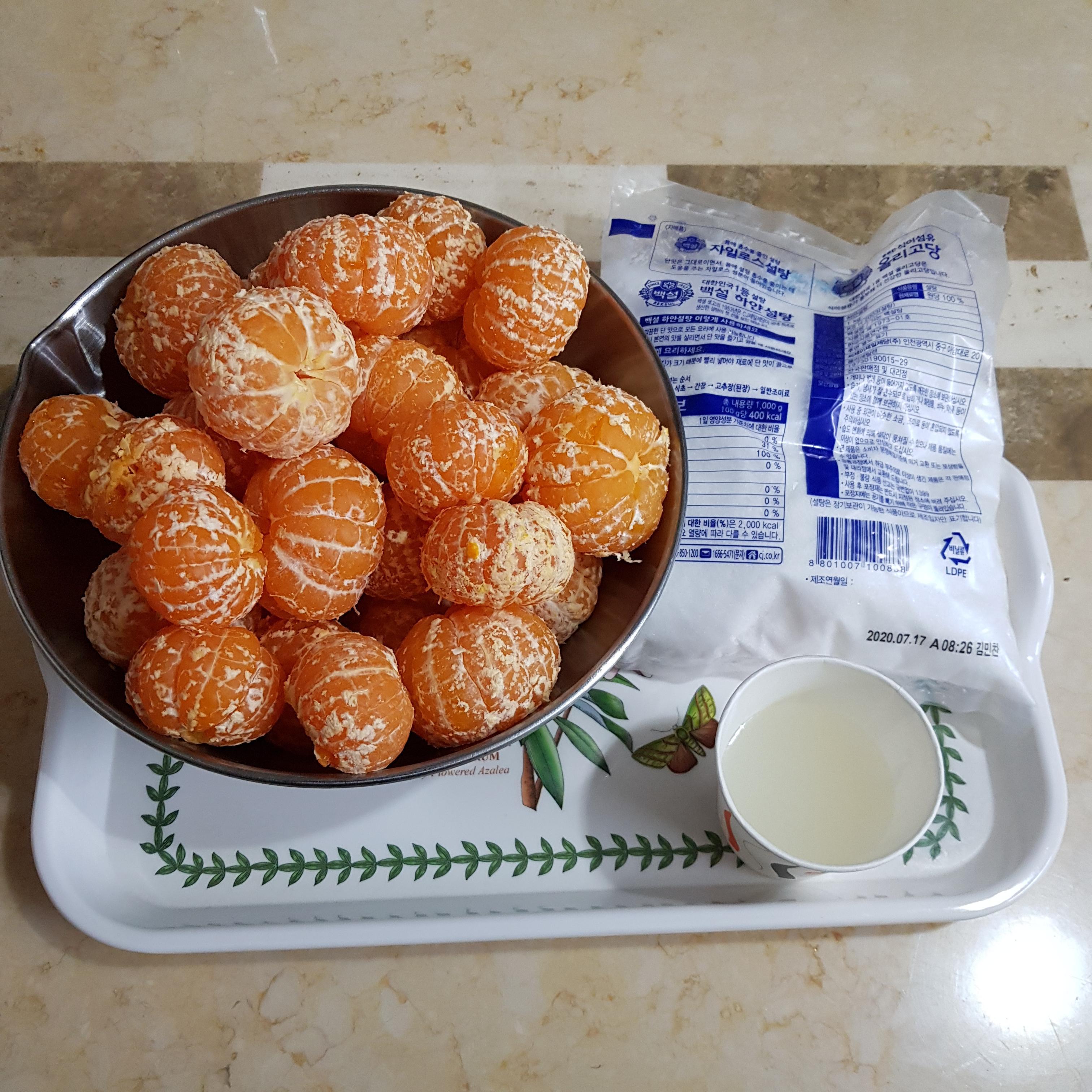껍질 벗긴 귤 2kg, 설탕 650g, 레몬쥬스 반컵, 소독한 유리병