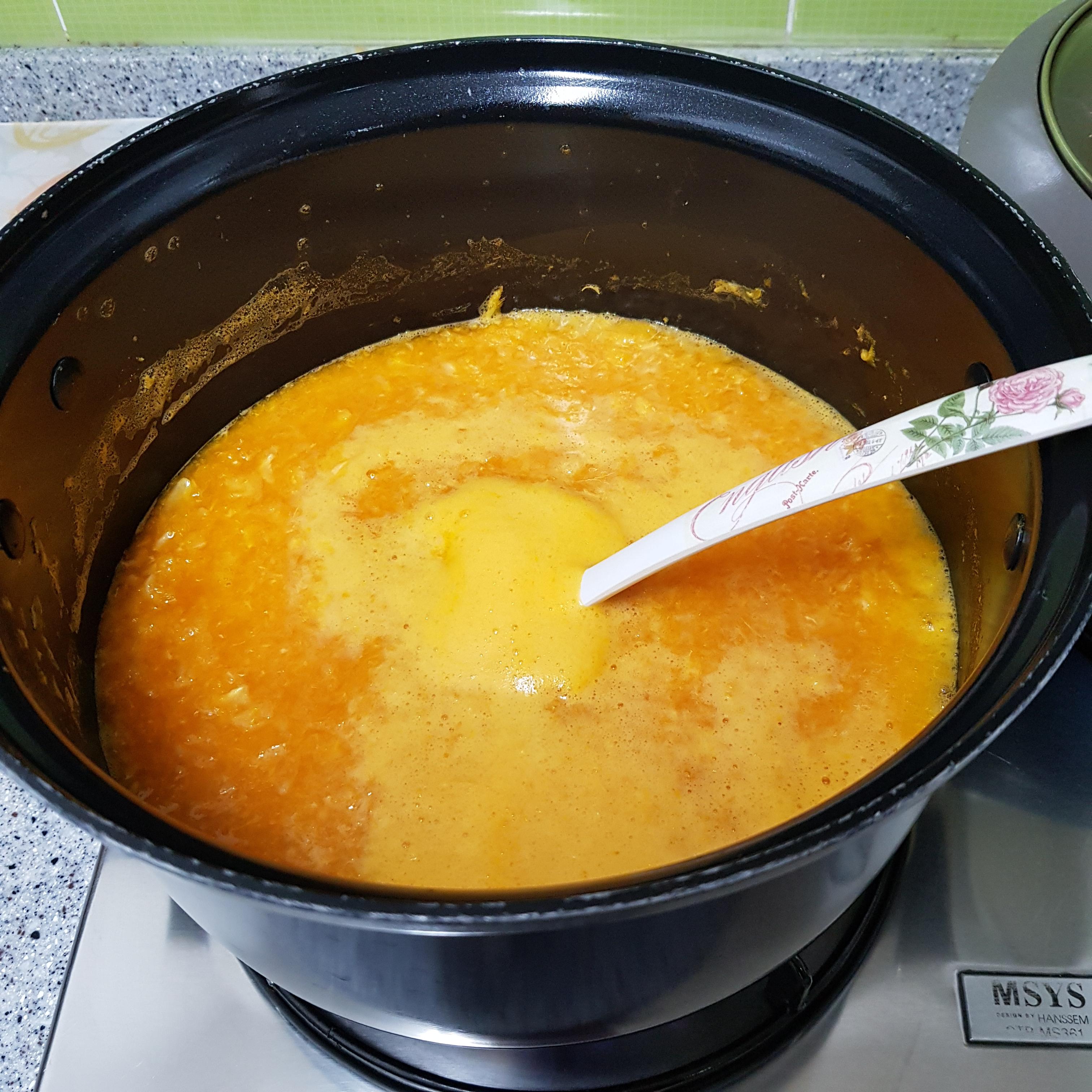 ▶ 설탕을 넣은 후 레몬주스 반컵 또는 레몬즙 약간 넣어주고 중불로 조절해 30분 정도 더 끓여주세요 농도가 짙어갈수록 많이 튀니깐 넉넉한 냄비에 끓여주는 게 안전하며 귤잼의 농도는 주르륵 흐르는 정도의 농도면 충분하답니다