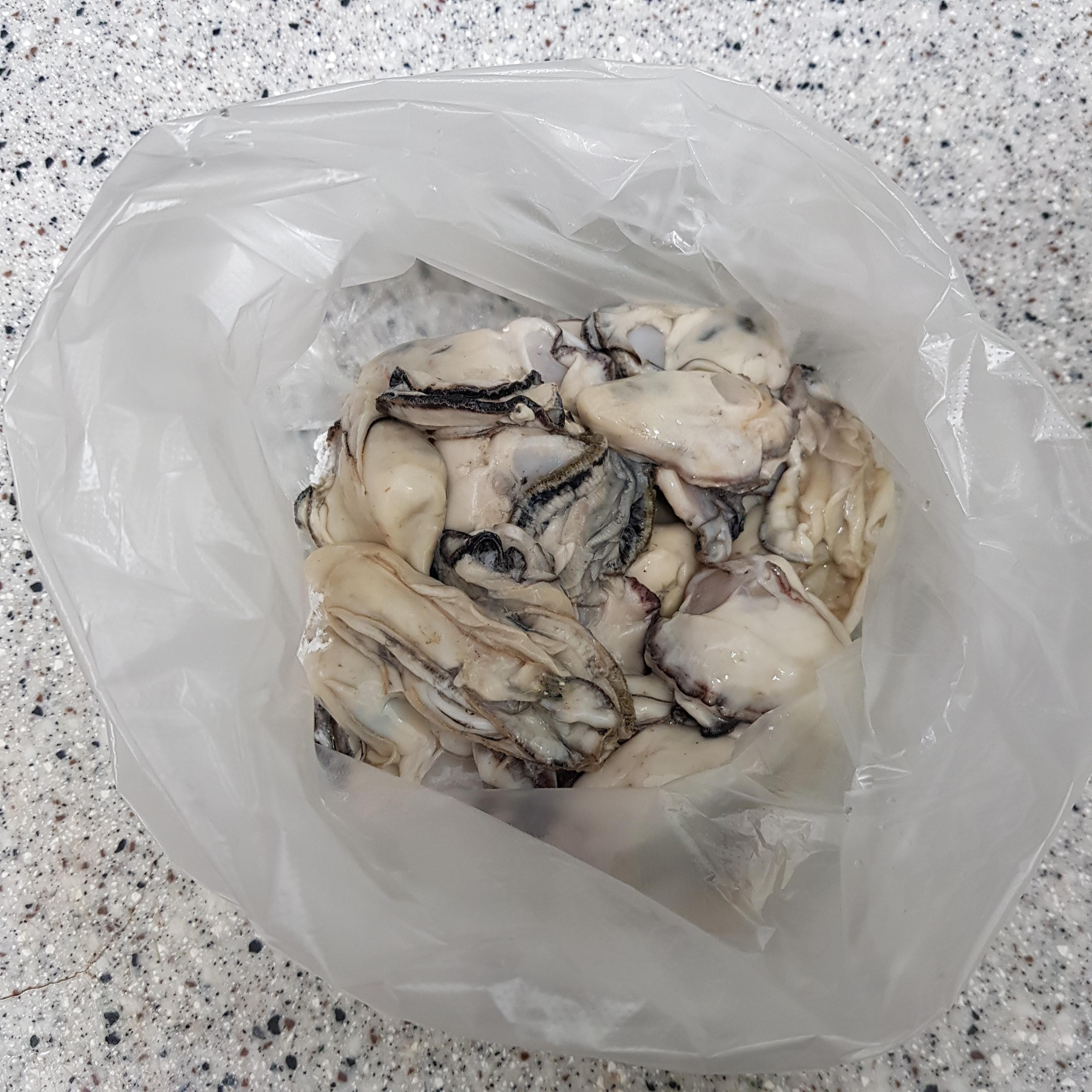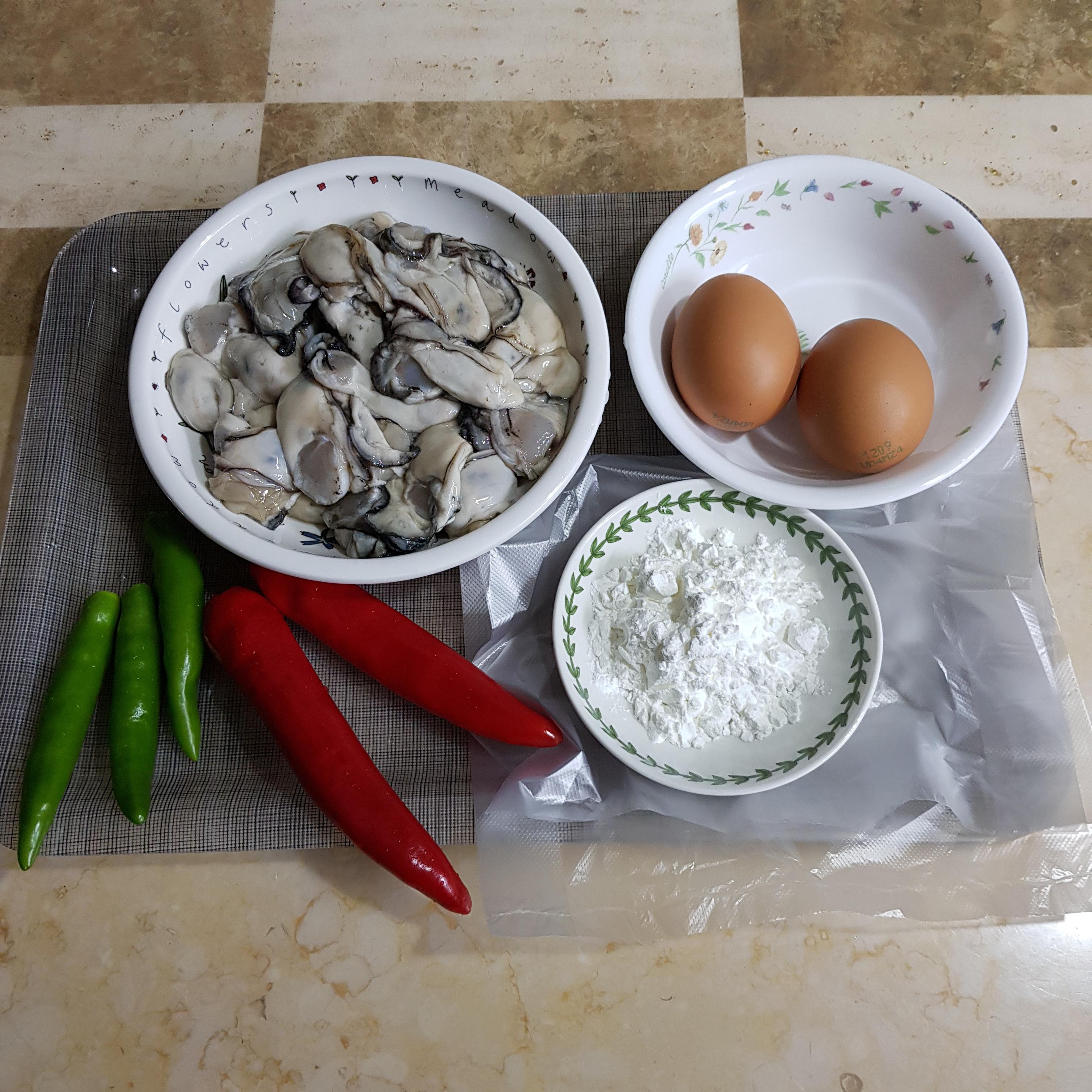 굴 350g, 달걀 2개, 고운 소금 반티스푼, 청양고추 3개, 홍고추 2개, 전분가루 1큰술 반, 일회용 비닐팩, 물 4컵+식초 2큰술+소금 1큰술(굴 데침용)
