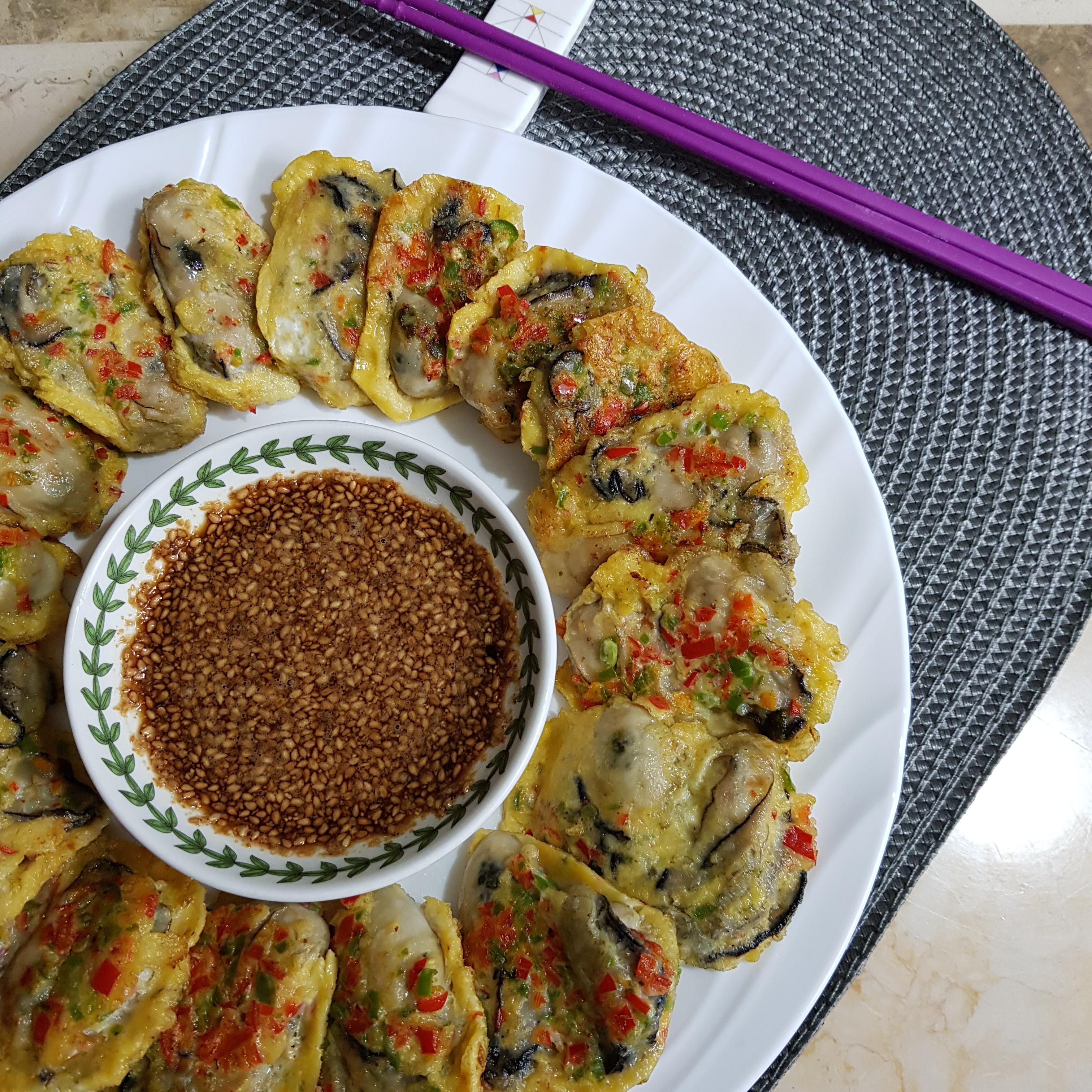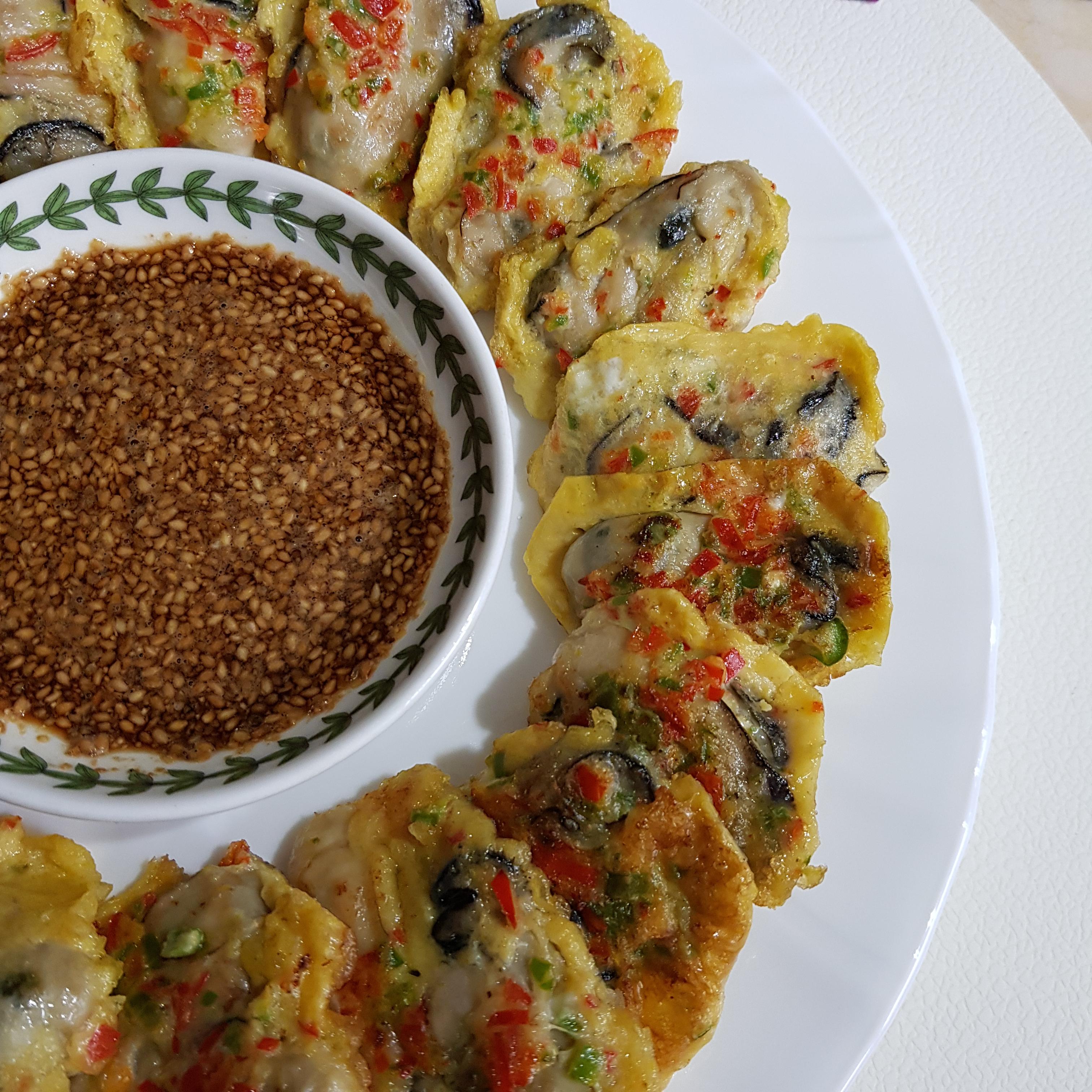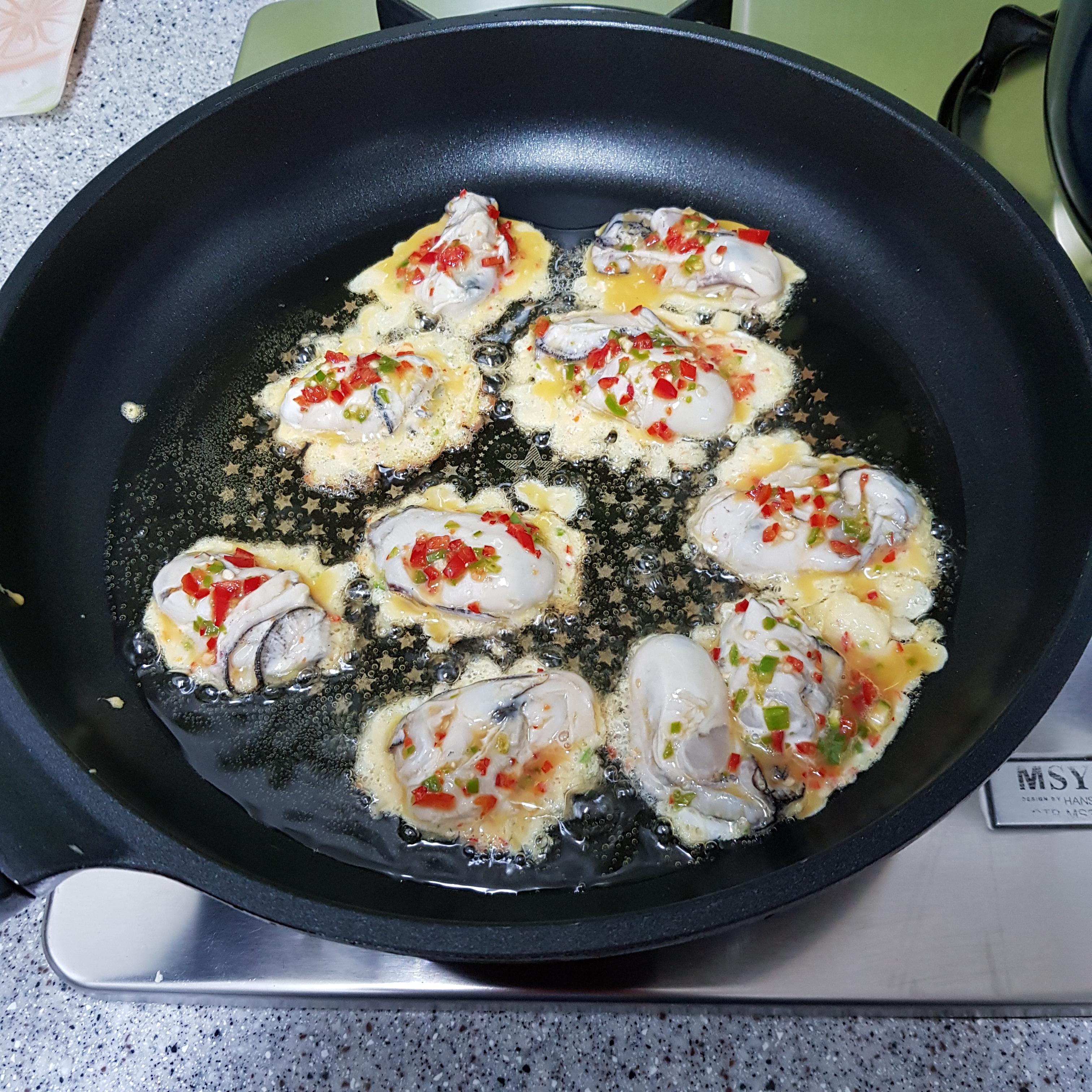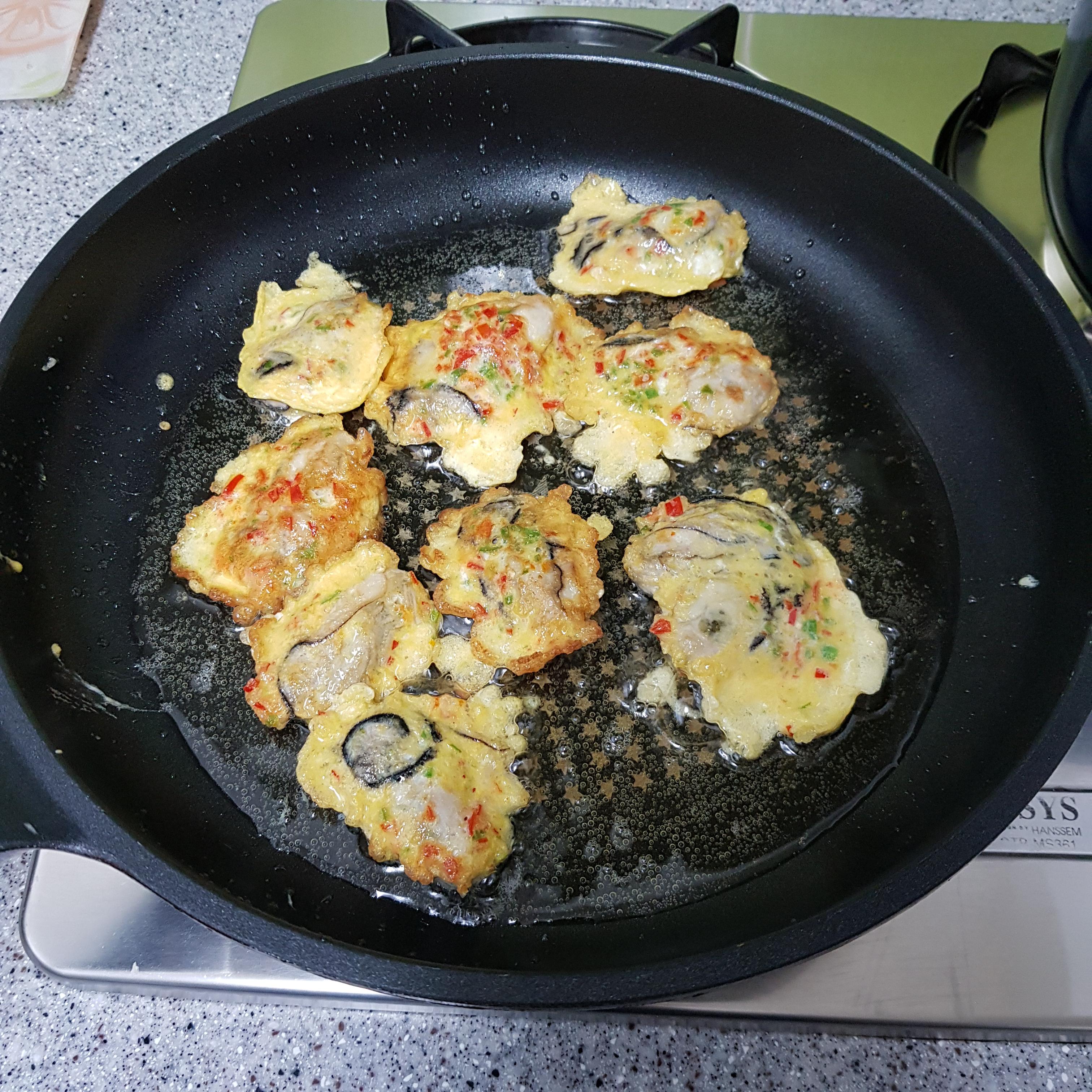 ▶ 한번 데친 굴은 물기 탓에 전분이 뭉칠 수 도 있으니 전분 묻힌 굴은 살살 털어가며 달걀물에 적신 후 중불에 기름을 넉넉히 두르고 올려주세요 이때 젓가락을 사용하면 다진 고추가 흘러내리므로 숟가락으로 굴을 떠서 올려주세요