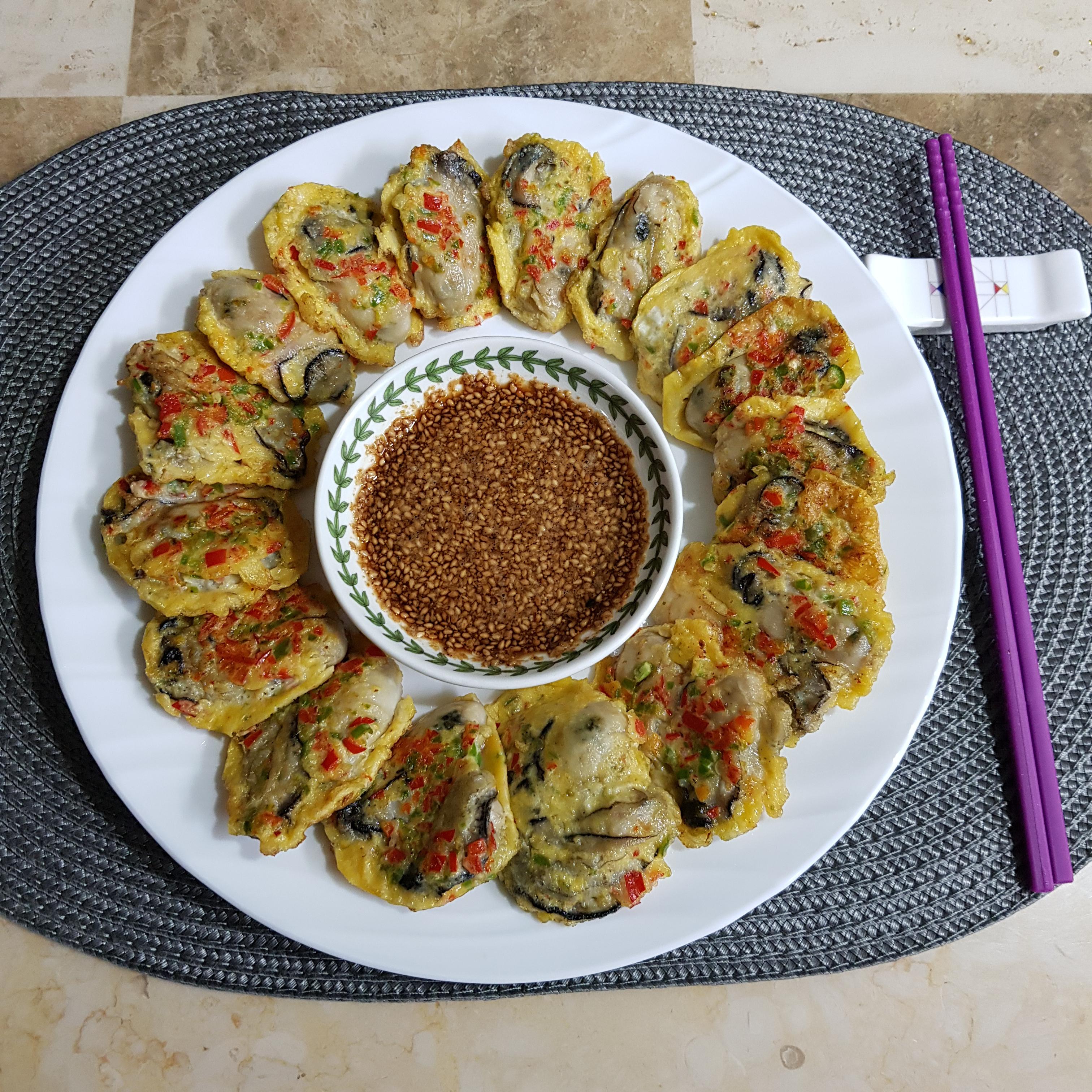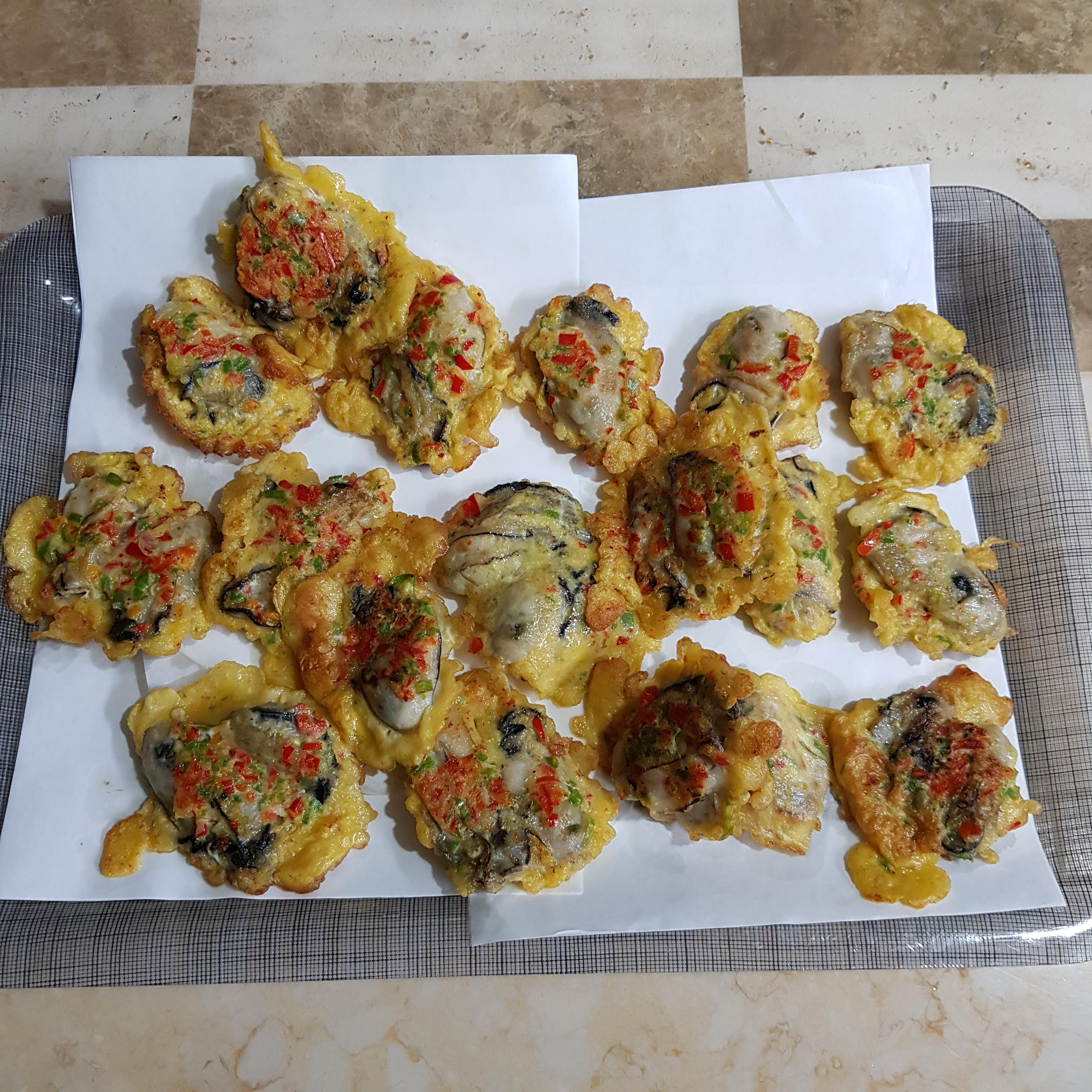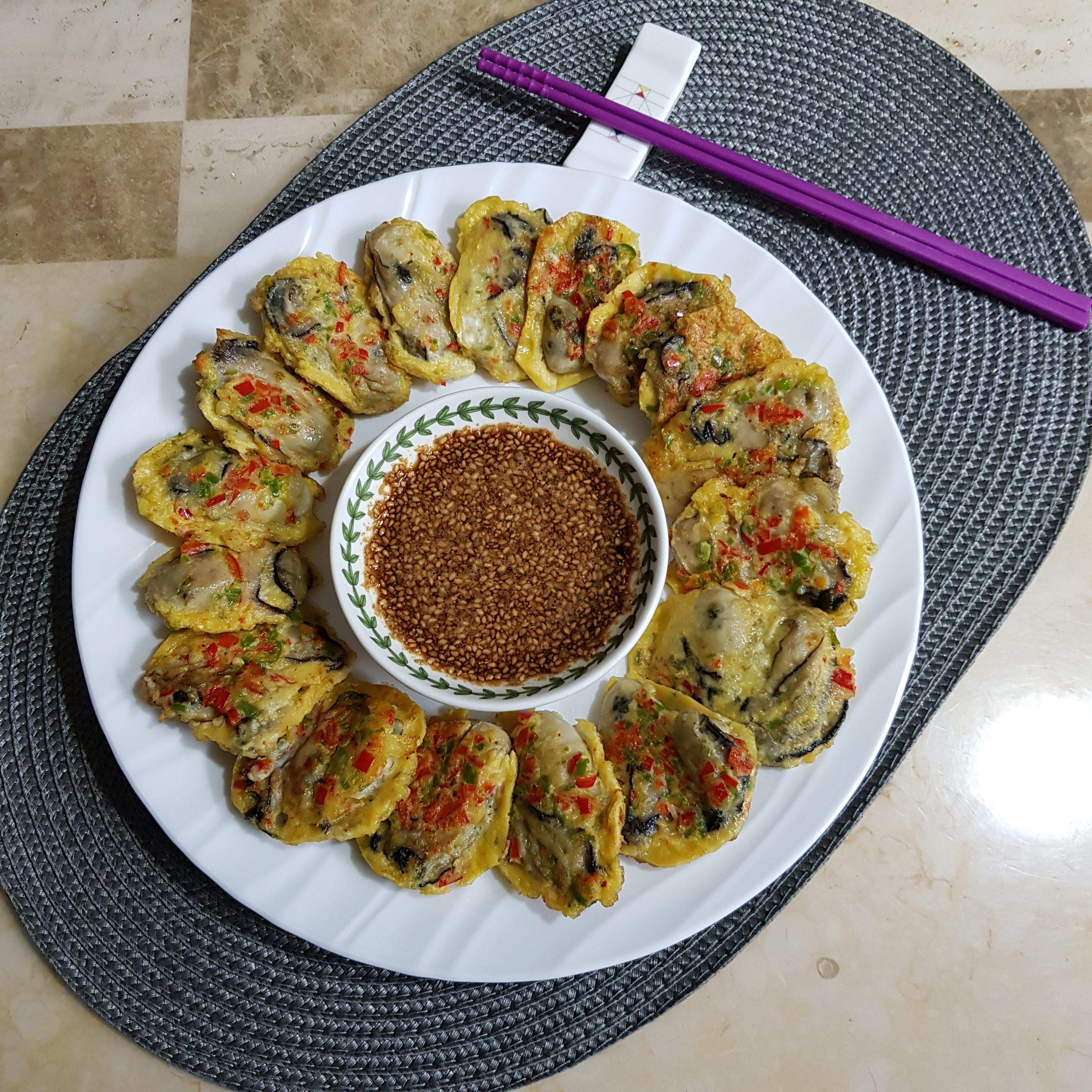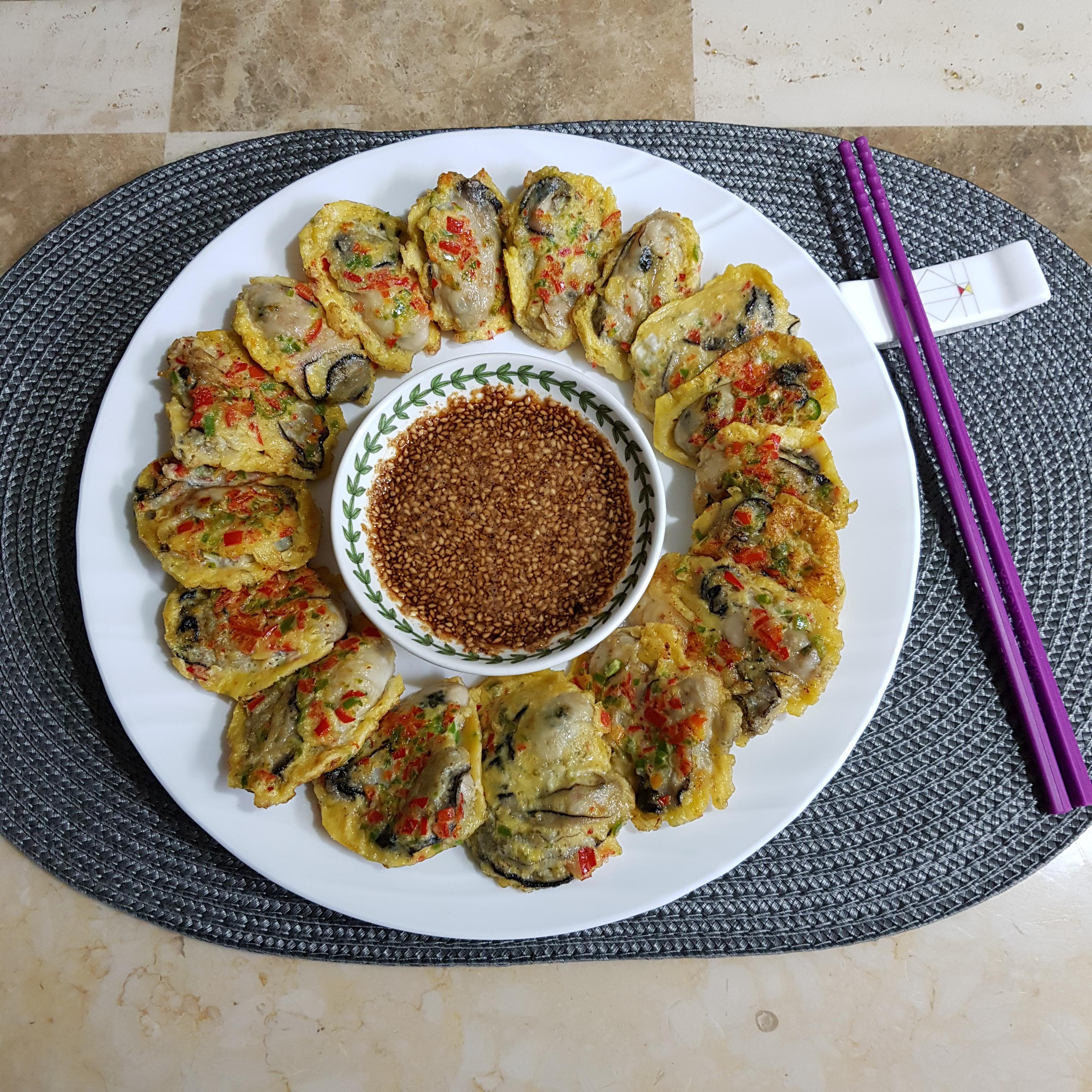 ▶ 한번 데친 굴은 물기 탓에 전분이 뭉칠 수 도 있으니 전분 묻힌 굴은 살살 털어가며 달걀물에 적신 후 중불에 기름을 넉넉히 두르고 올려주세요 이때 젓가락을 사용하면 다진 고추가 흘러내리므로 숟가락으로 굴을 떠서 올려주세요
