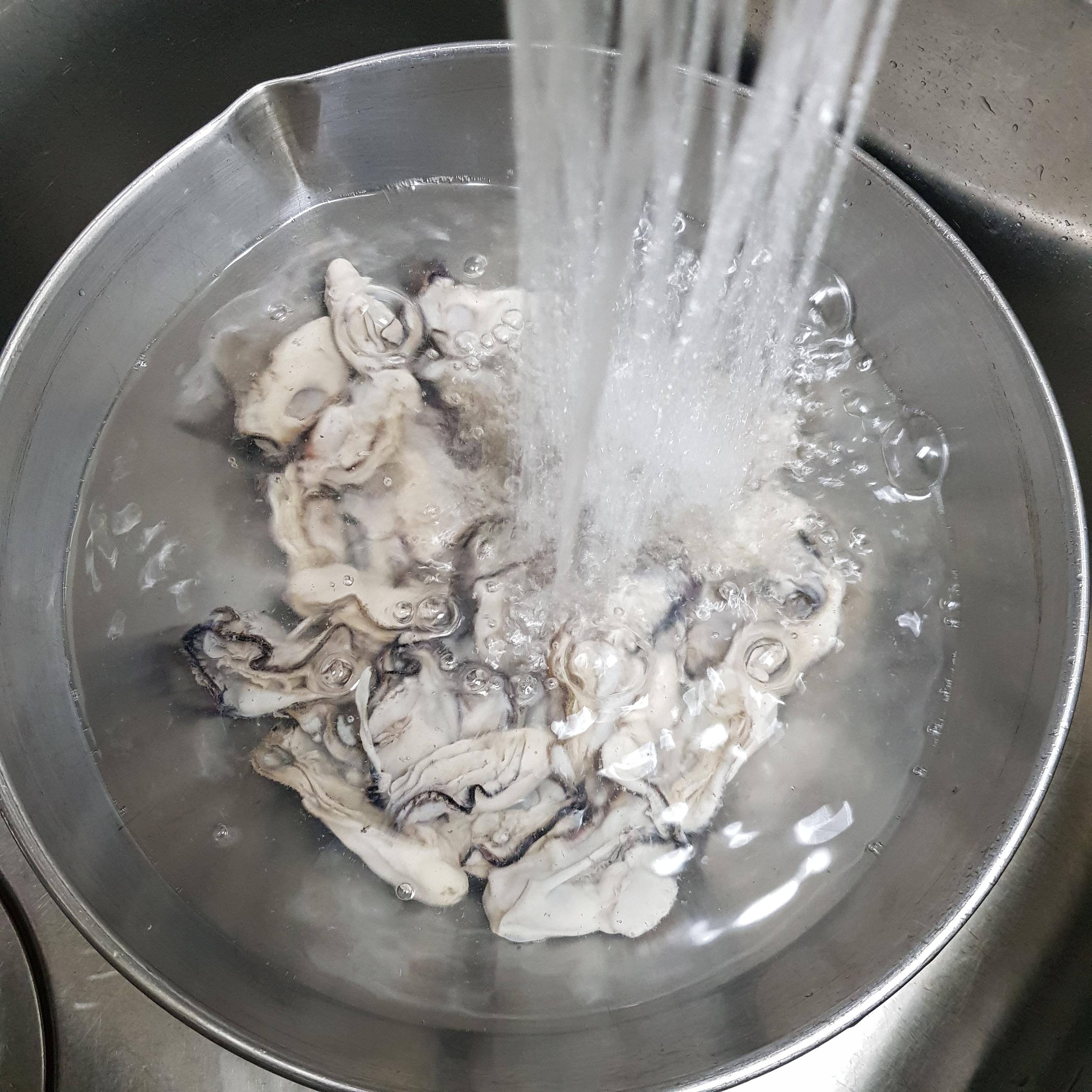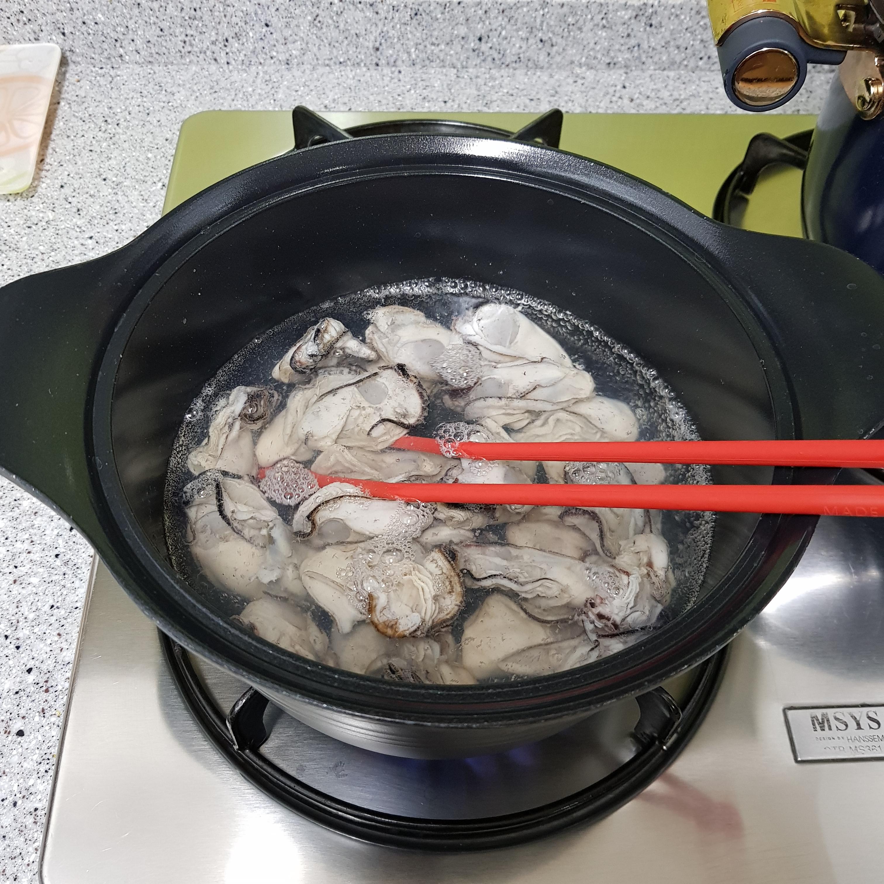▶ 깨끗이 씻은 굴은 냄비에 물 4컵을 넣고 물이 끓어오르면 소금 1큰술, 식초 2큰술을 넣어 20초 정도 데쳐주세요