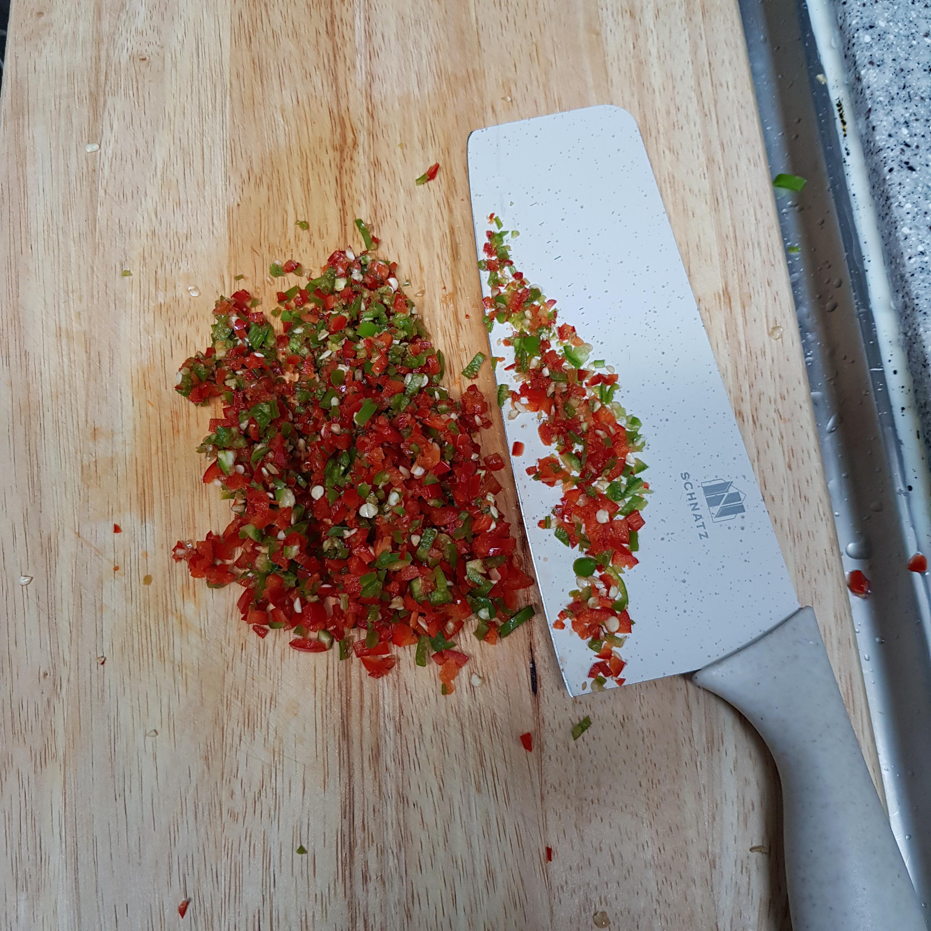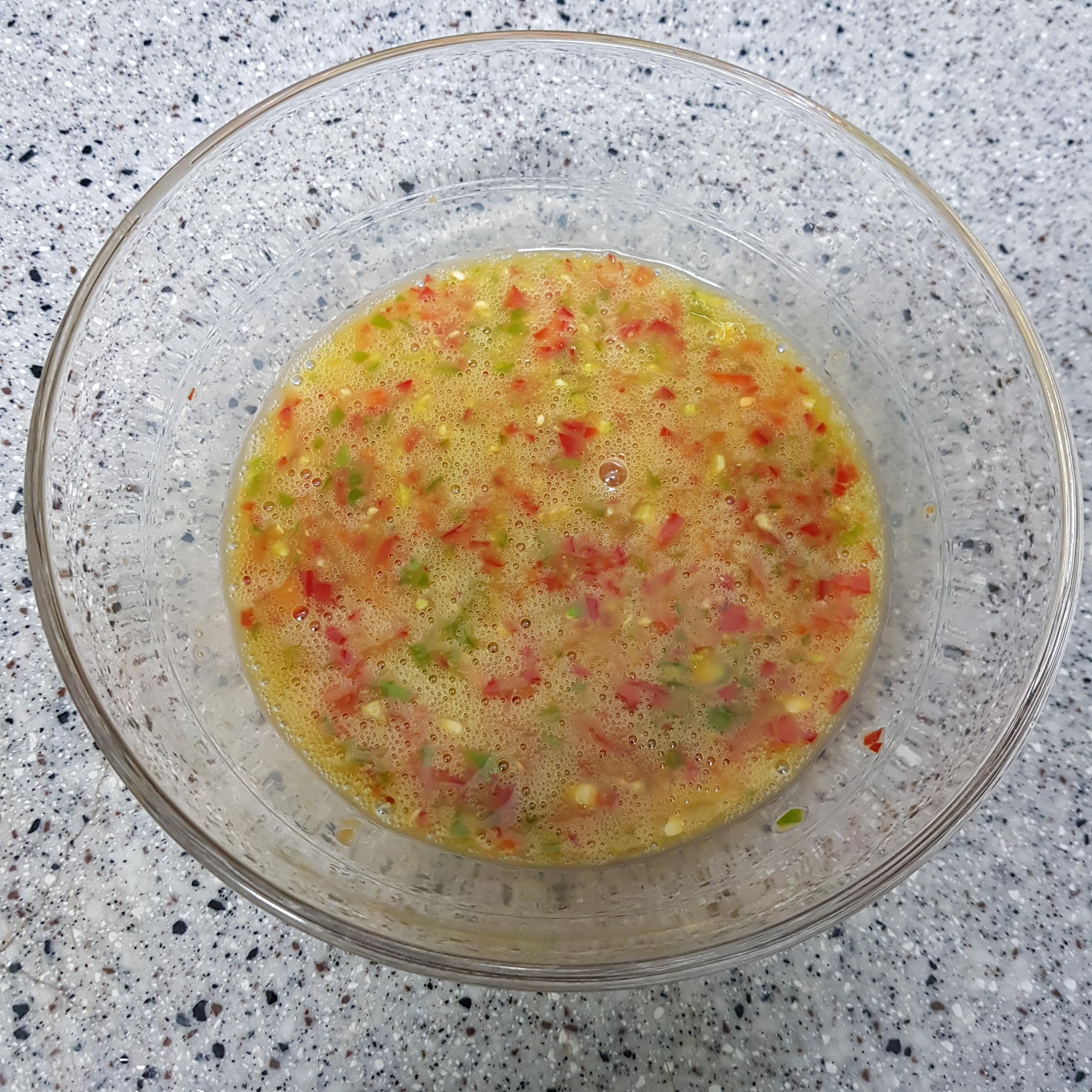 ▶ 청양고추 3개, 홍고추 2개를 다져서 넣고 섞어주세요 달걀물에 다진 고추를 넣어주면 조리하기 편리하고 뭉치지 않아 맛의 조화로움과 굴에 달걀물이 잘 입혀지는 효과가 있답니다