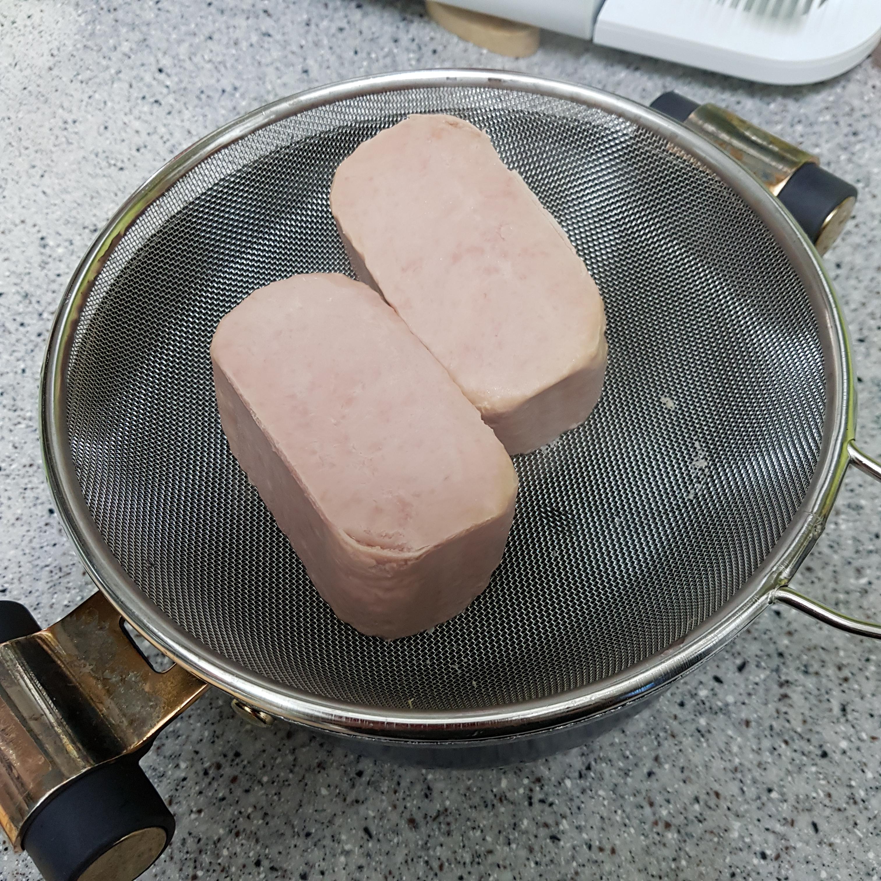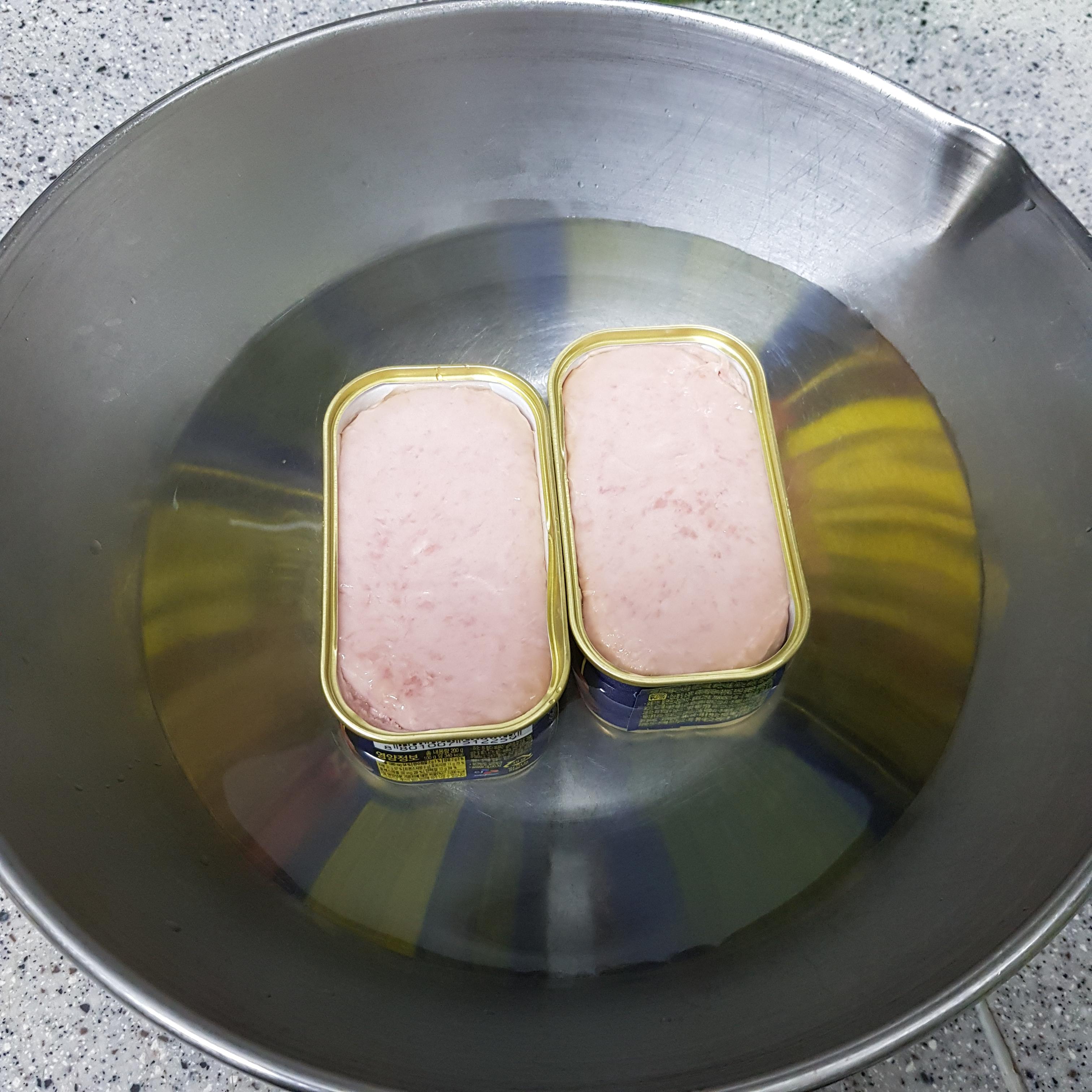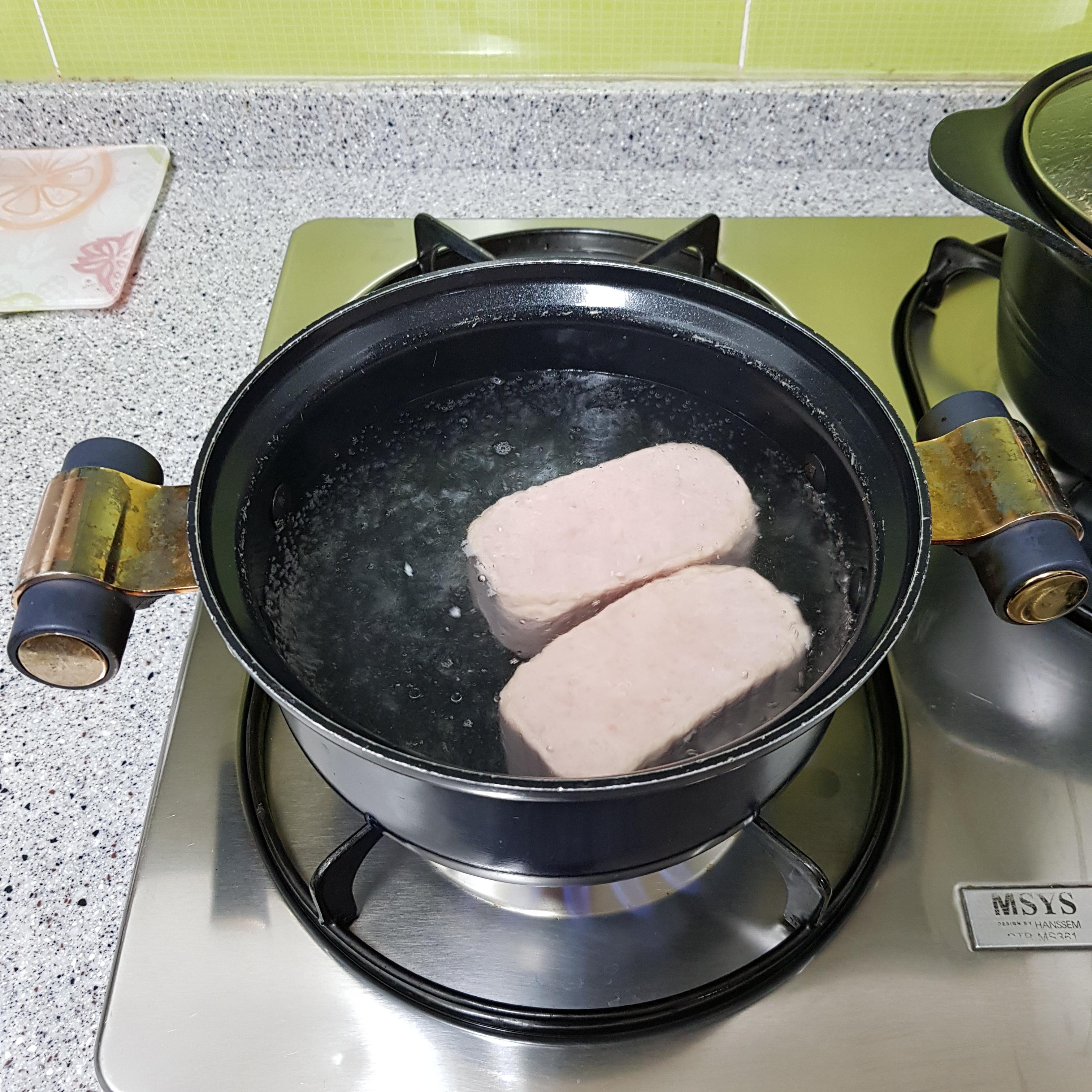 ▶ 아질산염, 보존제 등 각종 식품 첨가물이 들어있는 햄 통조림을 끓는 물에 데쳐서 사용하면 염분과 기름기 제거에 도움을 준다고 하니 햄을 데쳐주고 채반에 밭쳐 물기를 제거해주세요