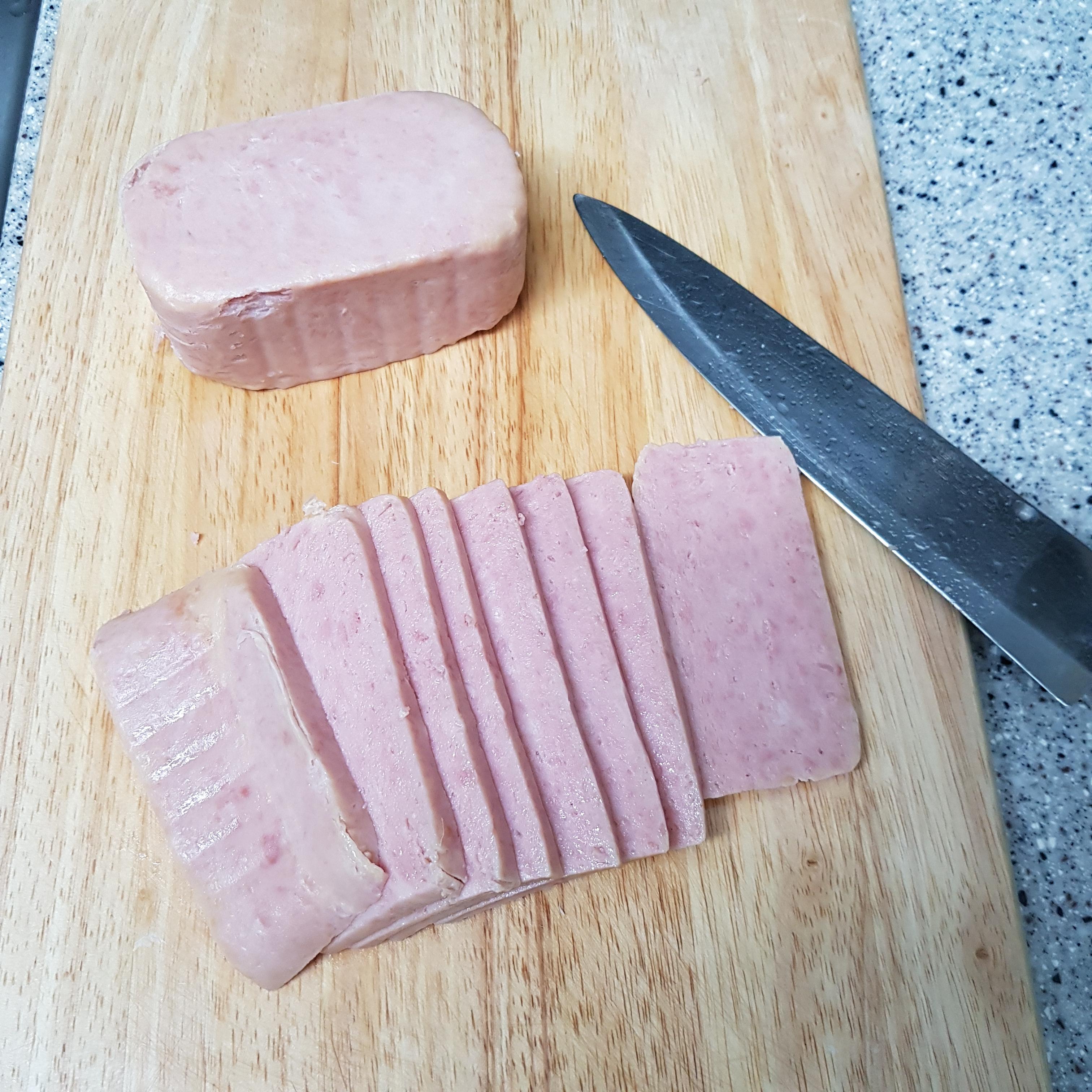 ▶ 데친 햄을 0.3cm~0.4cm 정도 두께로 얇게 썰어주세요