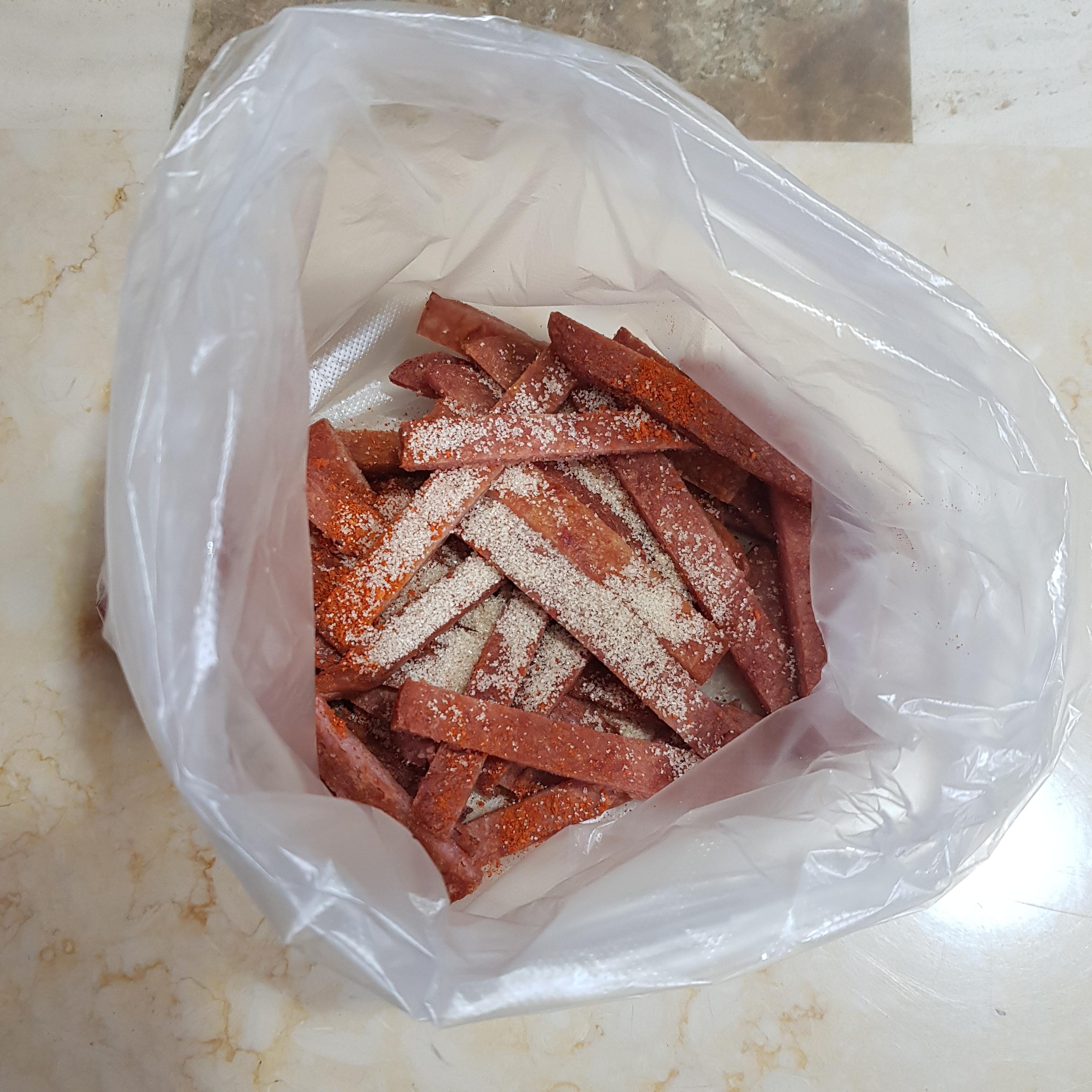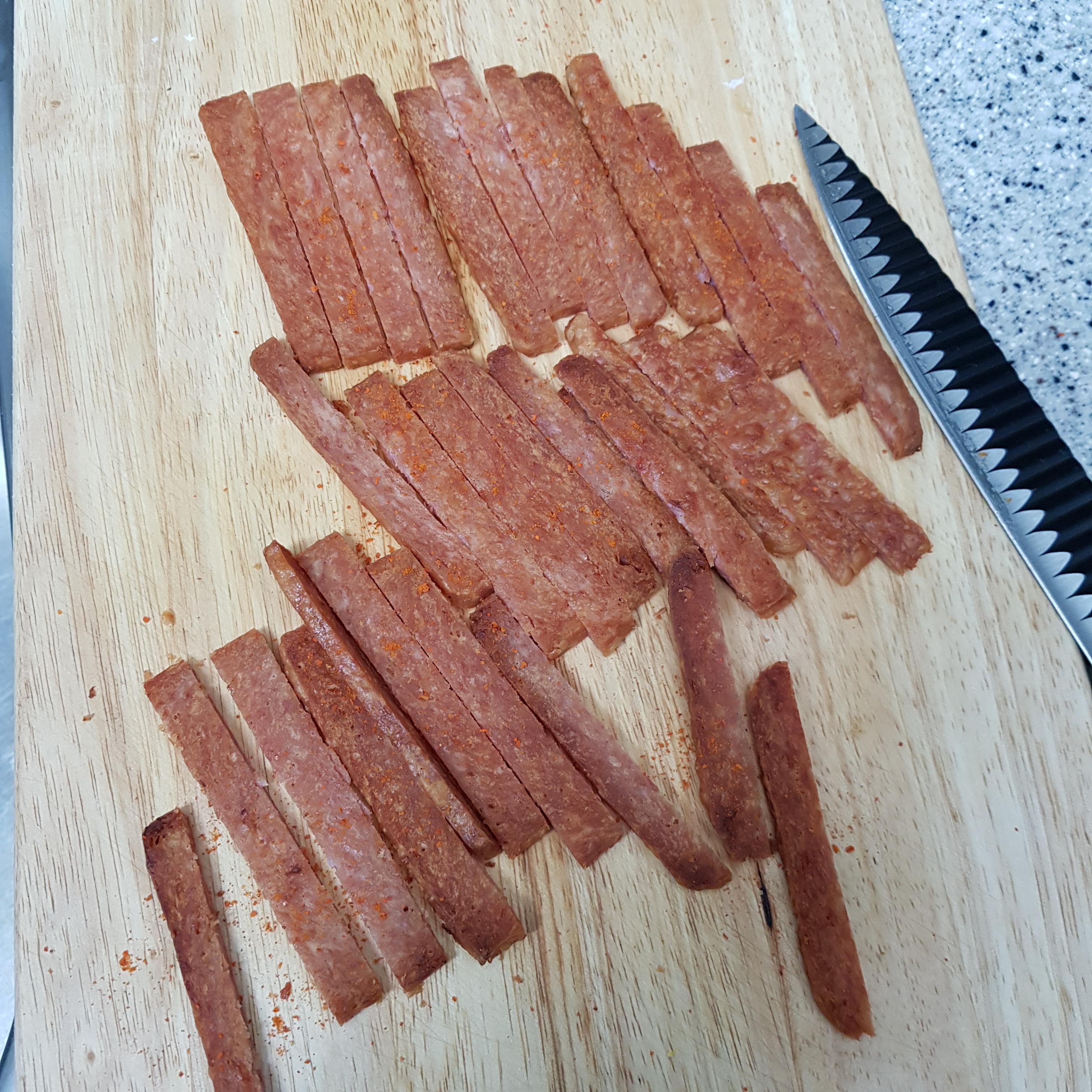 ▶ 기름기를 제거한 알토란 햄육포는 먹기 좋은 크기로 껄쭉하게 썰어주고 고운고춧가루를 취향껏 뿌려주시면 알토란 햄육포 완성입니다 써니네는 매콤한걸 좋아해 매운 청양고춧가루를 뿌려주었답니다 취향껏 설탕을 약간 뿌려주셔도 된답니다^^ 참고로 간식으로 하실꺼면 햄을 리챔을 사용하시면 간이 맞고 술안주로는 스팸이 간이 맞는 것 같아요