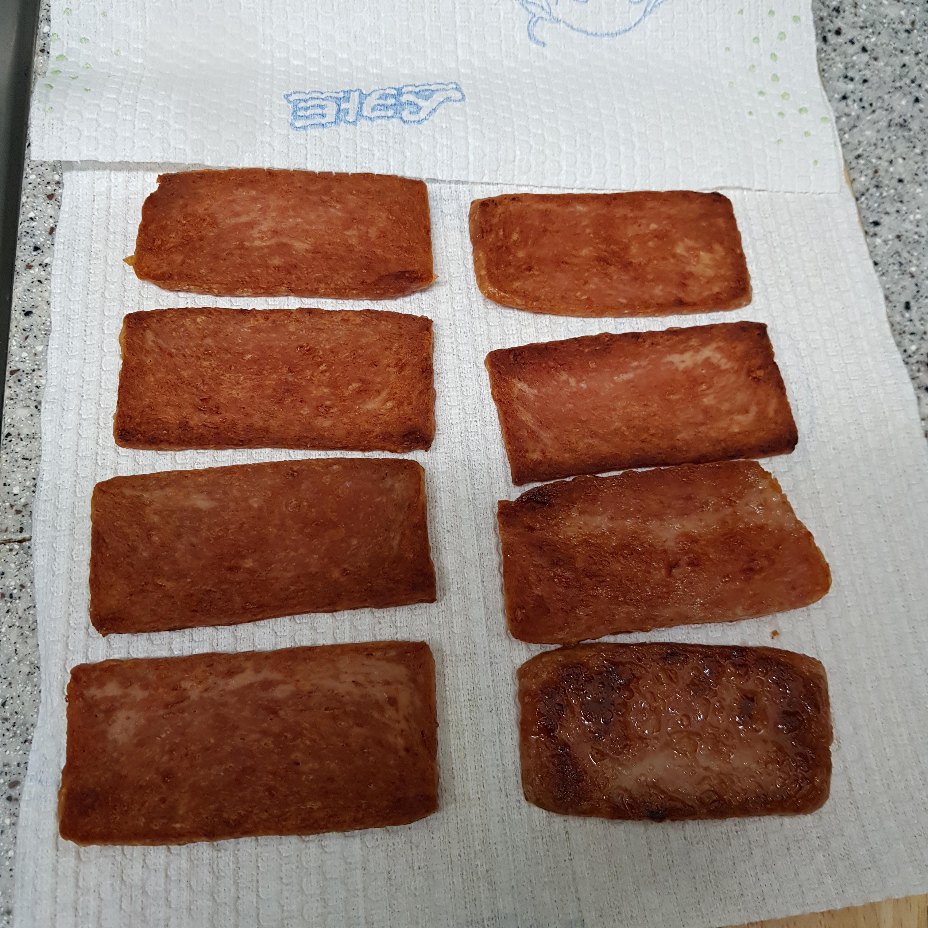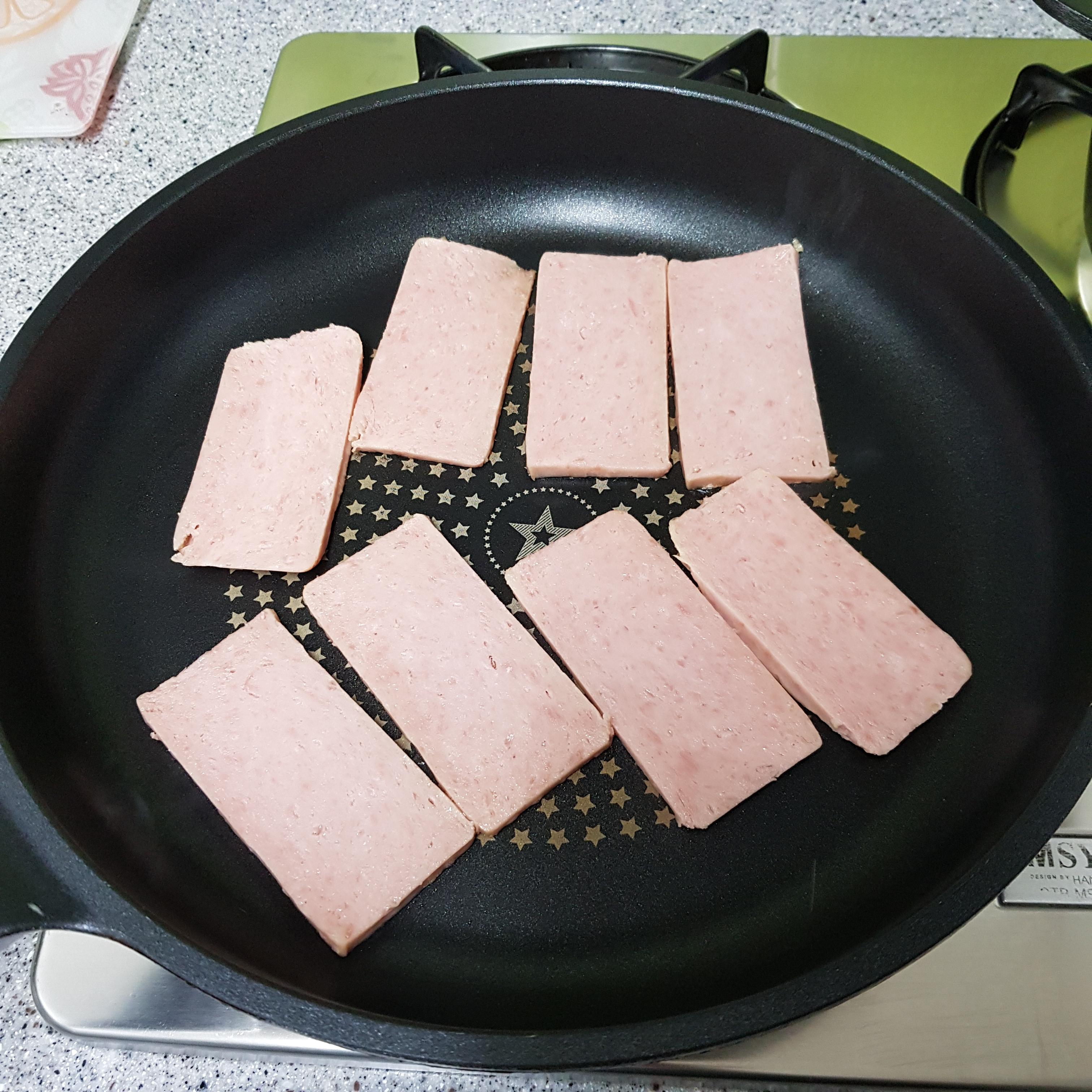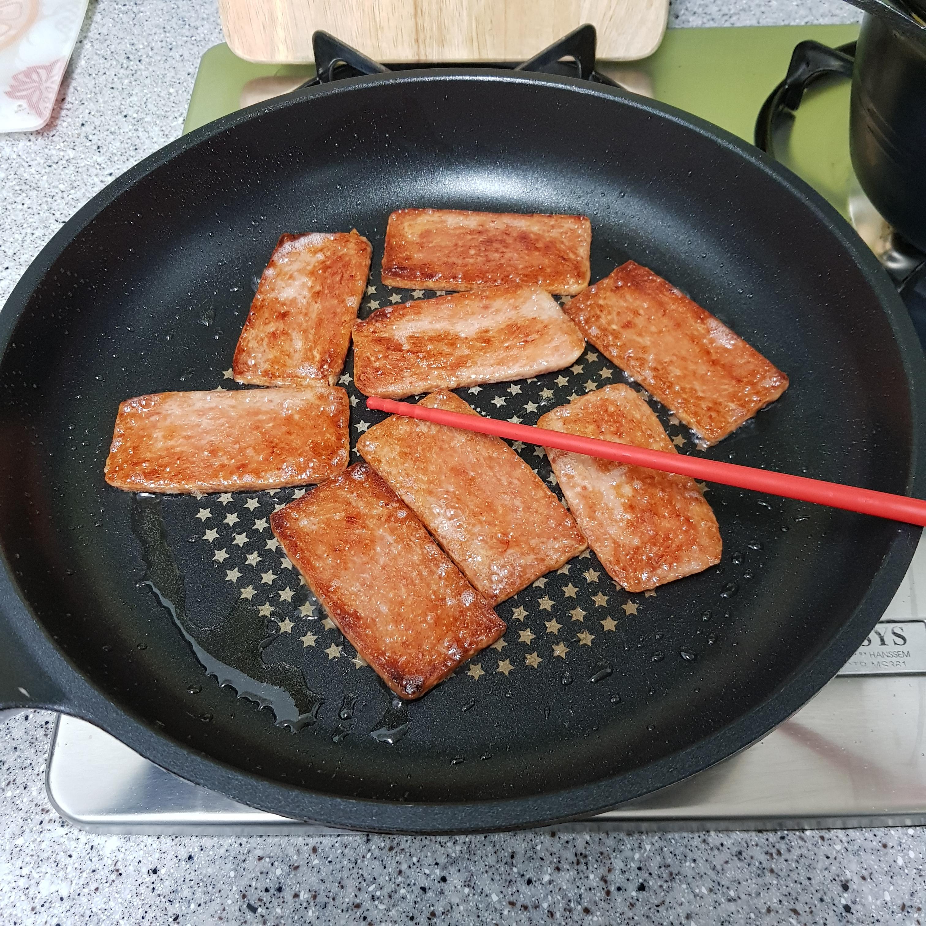 ▶ 얇게 썬 햄은 기름을 두르지 않고 중불에서 7~8분 동안 햄이 딱딱해질 때까지 구워주세요 참고로 중불을 사용해야 겉면이 타지 않고 햄 속의 기름이 충분히 빠져나온답니다 젓가락으로 햄을 눌렀을 때 햄이 뚫리지 않을 때까지 구워주세요