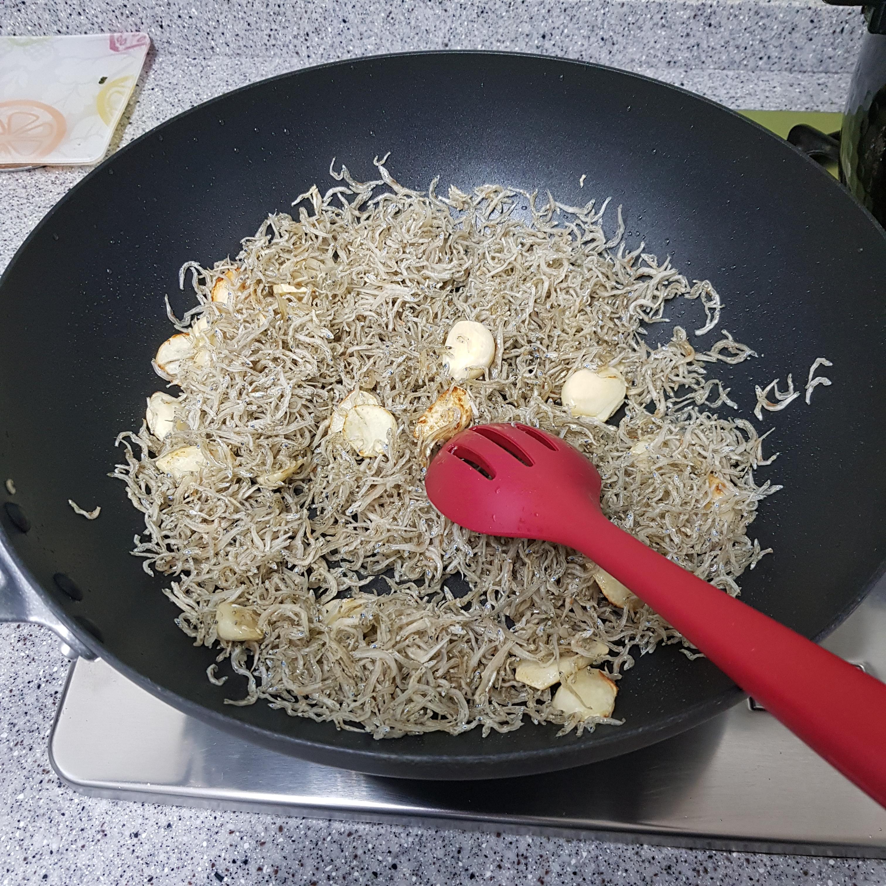 ▶ 애벌 볶기한 잔멸치 200g을 넣어주세요 마늘의 풍미가 더해져 향이 일품이랍니다 마늘 기름을 쏙 흡수한 멸치는 센 불에서 약불로 줄여 볶아주세요