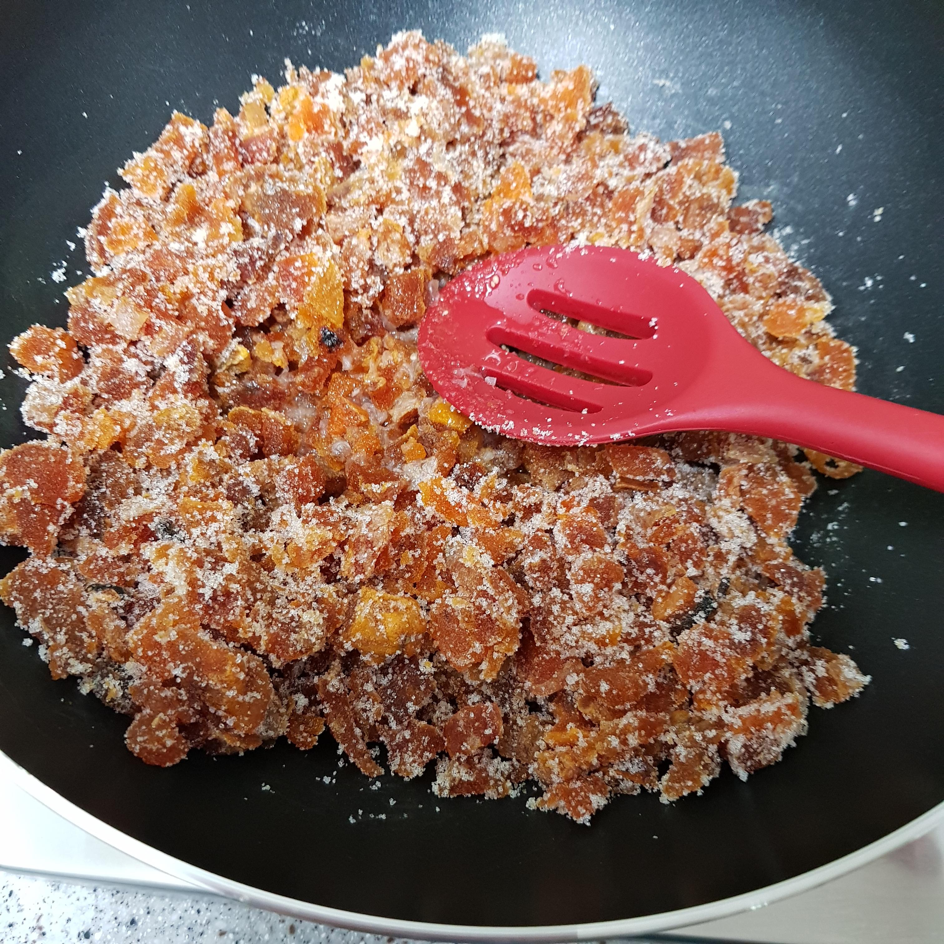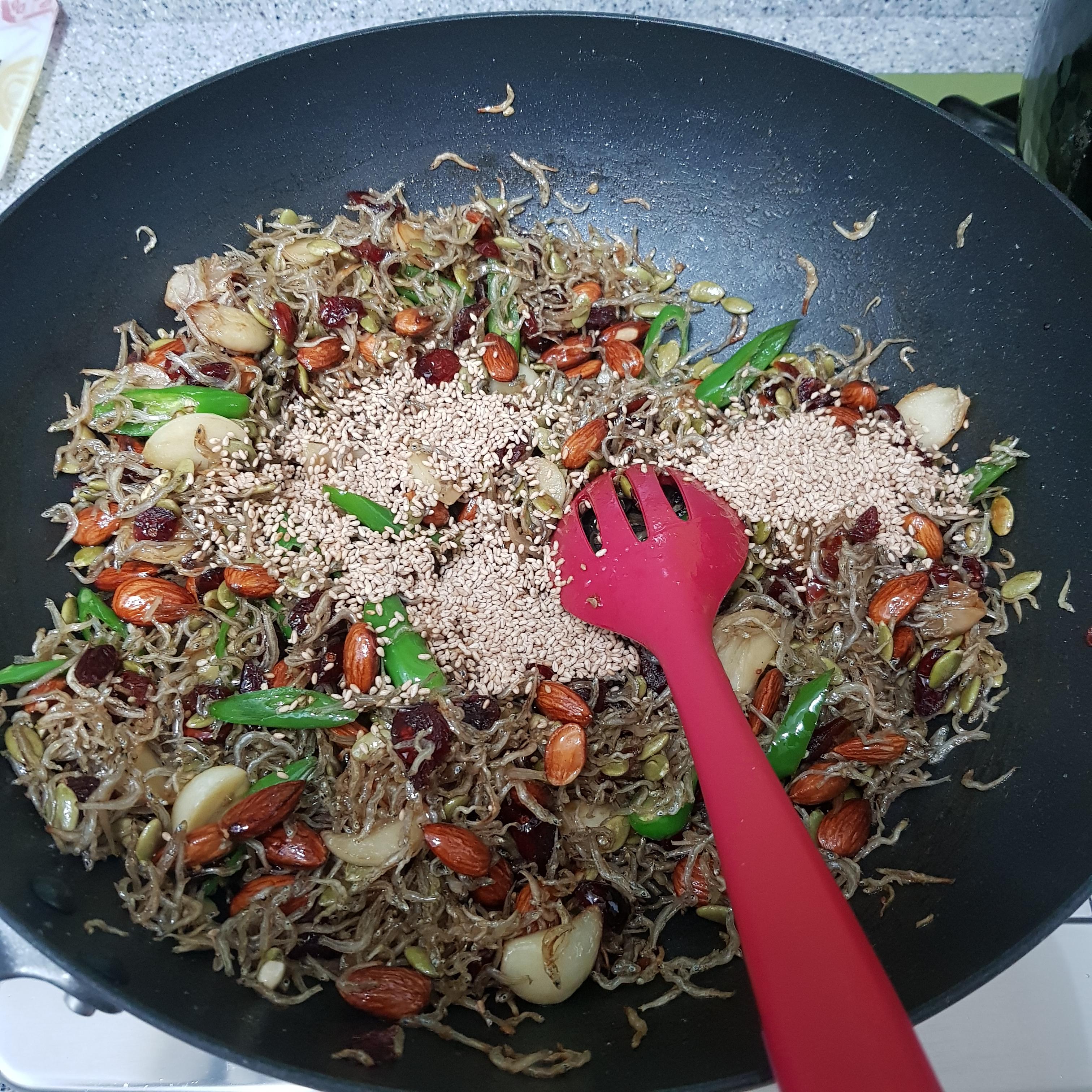 ▶ 볶은 후 불을 끄고 올리고당 3큰술, 통깨 3큰술을 넣어주세요 가열 중에 올리고당을 넣으면 식는 과정에서 멸치가 굳어 달라붙게 되니 불을 끄고 올리고당을 넣은 후 골고루 섞어주면 잔열에 섞었기 때문에 달라붙을 걱정은 안 하셔도 된답니다