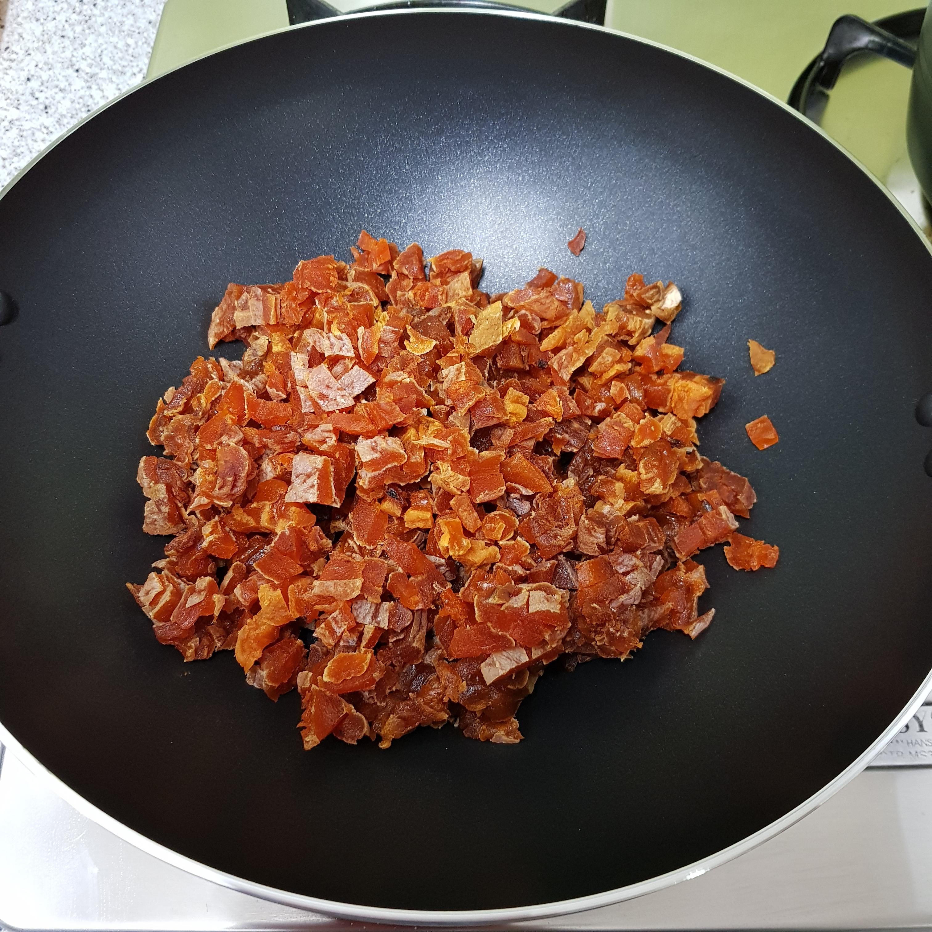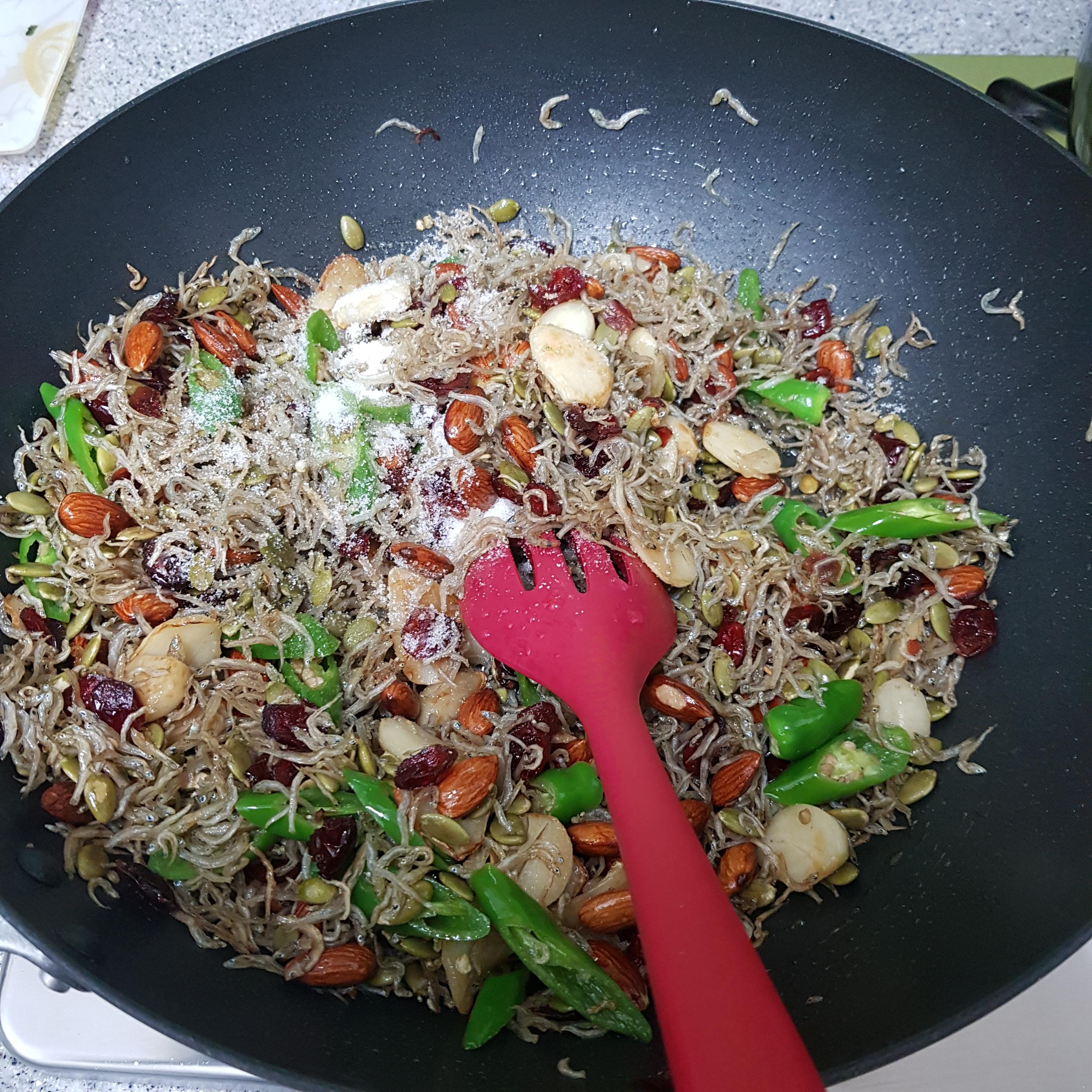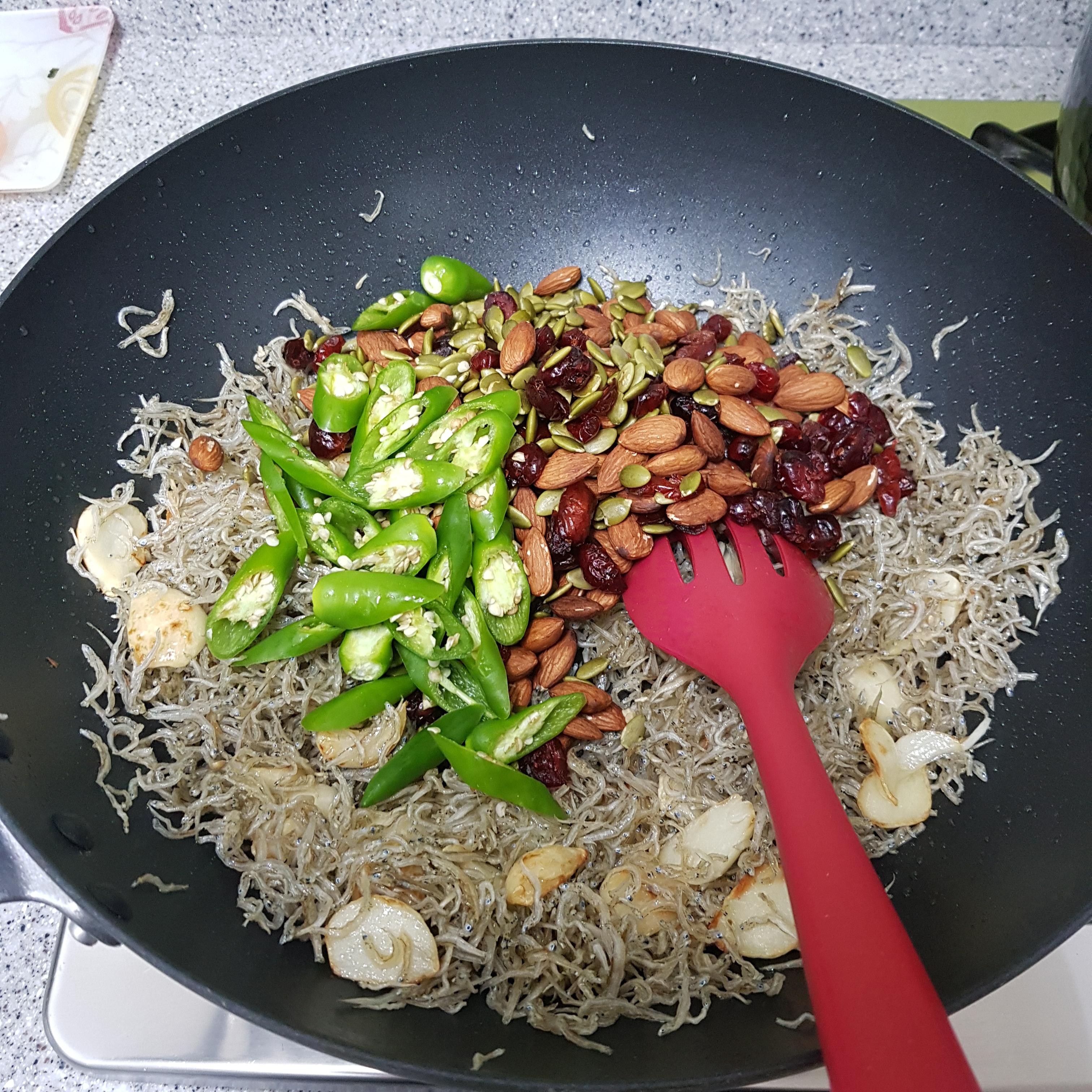 ▶ 애벌 볶은 견과류, 청양고추를 넣고 멸치와 마늘, 견과류가 타지 않게 잠시 불을 줄여주세요