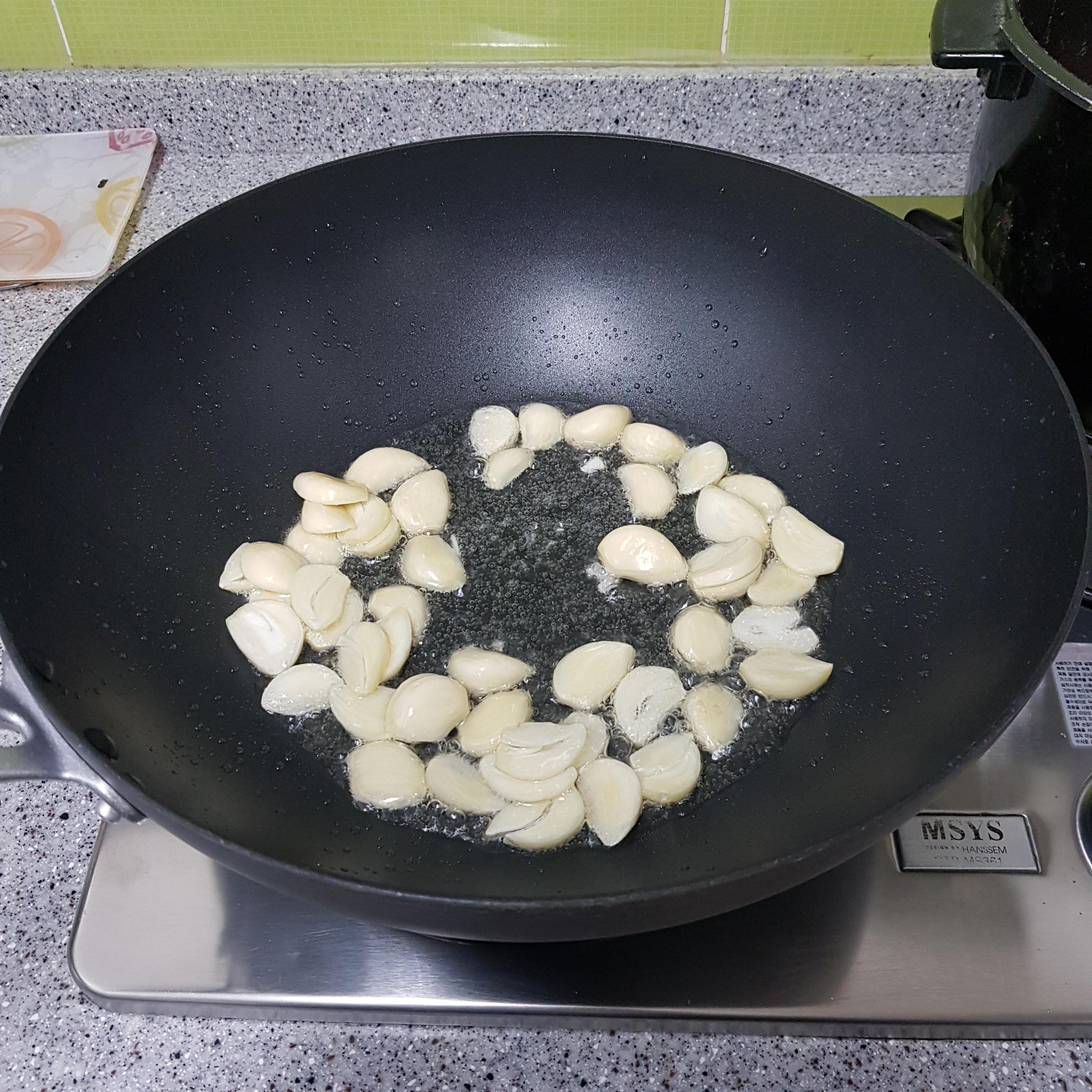 ▶ 팬에 식용유 5큰술 넣고 식용유가 달궈질 때까지 기다려주세요 달궈지기 전에 마늘을 넣으면 식용유의 온도가 올라갈 때 마늘의 수분 때문에 기름이 튄답니다 식용유가 달궈진 후 편 썰기한 마늘 100g을 넣고 살짝 노릇해질 때까지 타지 않게 달달 볶아주세요 마늘 기름을 사용하면 멸치의 비린맛도 잡고 풍미를 더해준답니다