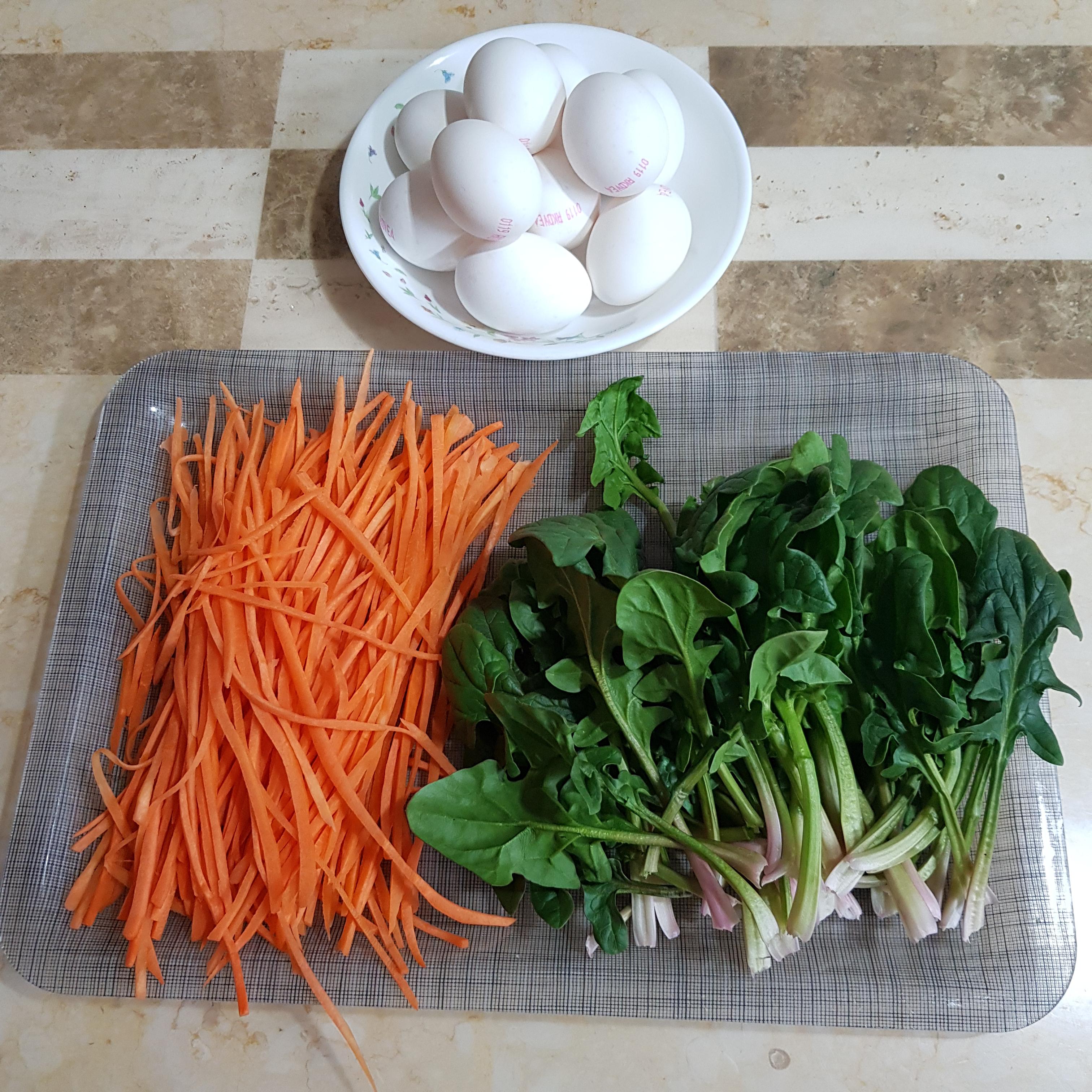 계란 10개, 곱게 채 썬 당근 150g, 뿌리 자른 시금치 100g, 소금 1티스푼+후추 약간(달걀 물에 넣는 용)